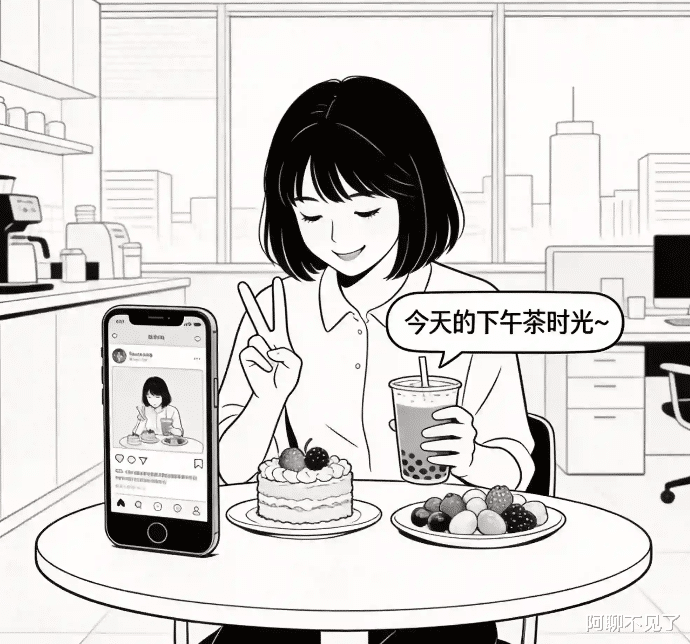 朋友圈永远精致:高级酒店的下午茶、网红餐厅的摆盘、新款包包、鲜花、自拍笑得一脸灿烂。