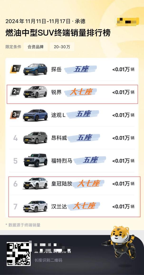 可喜可贺!锐界L的销量起来了!之前在车友群看到有人说,锐界L最近的销量不错,刚去翻了下销量统计,看到11月第二周销量榜,锐界L力压汉兰达、陆放、途昂等车,成了好多地区的大七座销量NO.1。