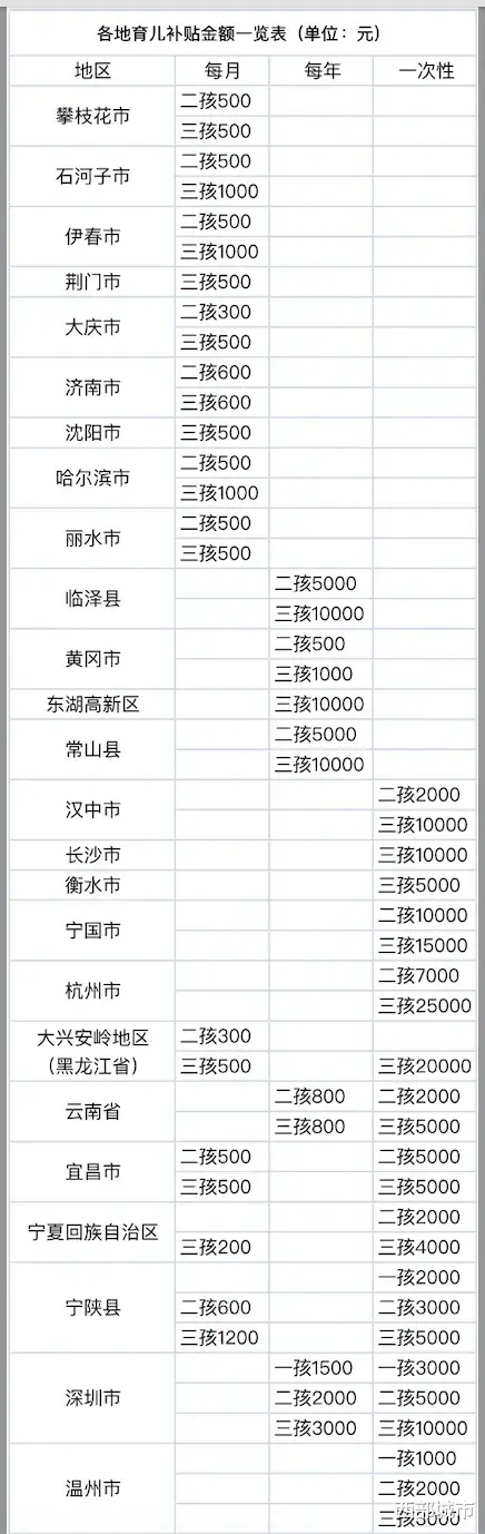 如2021年,四川攀枝花市就在全国率先推出“为二、三孩家庭每孩每月发放500元补贴金直至孩子3岁”的政策。