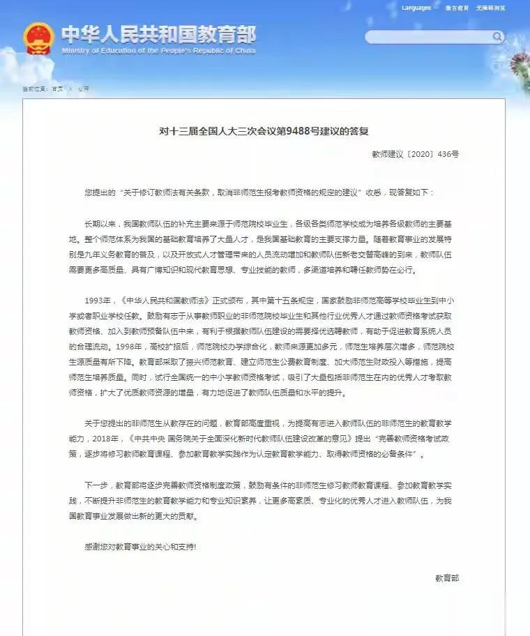 也有人表示,教师招聘对象只看教师资格证书,非师范专业的毕业生教师专业水平很难保证。教师队伍需要一种师范生的精神和情怀。