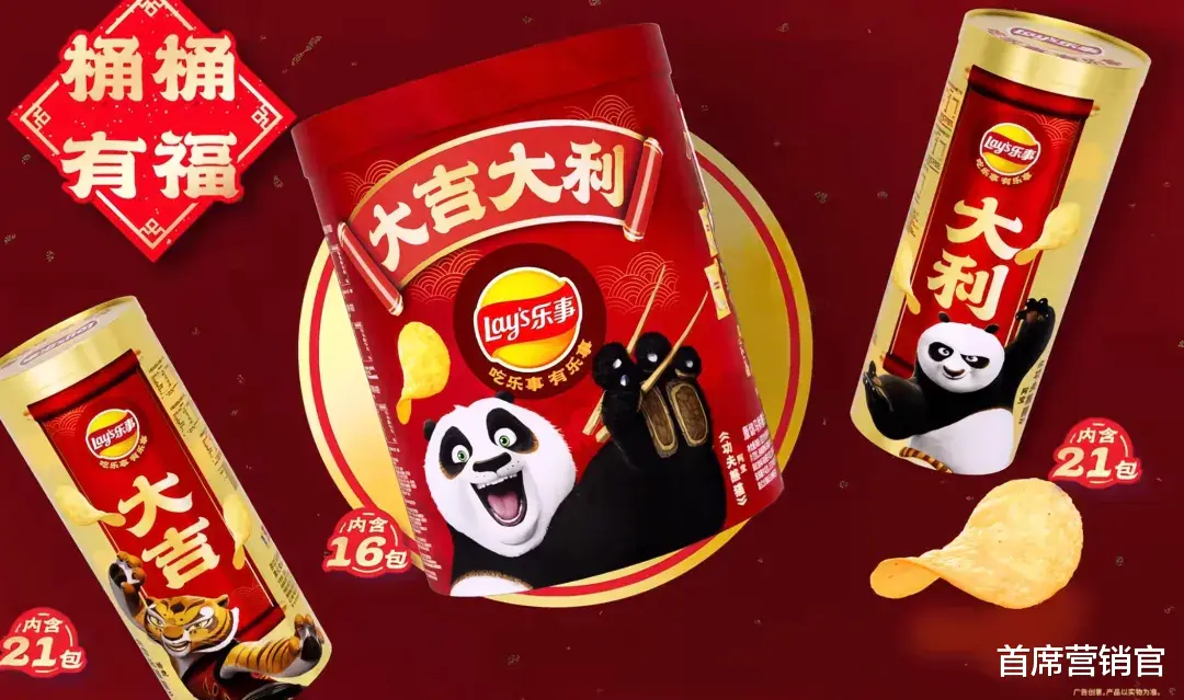 因此,乐事围绕春节家庭与聚会场景,集中推出了以新春大礼包和礼桶为主的多款产品,并通过“金砖开运”等主题礼盒,以及裸米饼裸鲜贝、薯条等春节限定品类,进一步延展了节日餐桌的丰富度。在包装设计上,乐事为春节限定分享装融入《功夫熊猫》IP 联名元素,以更具节庆氛围的视觉语言呈现。灯笼、福字等传统元素巧妙融入插画,让消费者第一眼就能感受到浓浓的年味。
