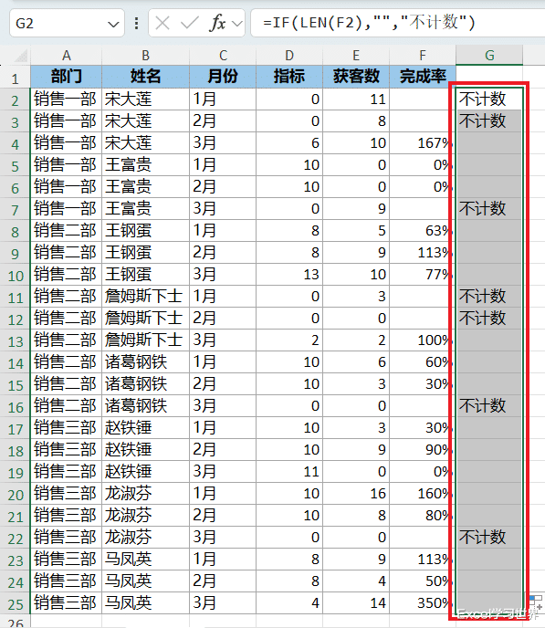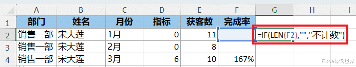 从下图 2 可以看出,下图 1 中 F 列的完成率是根据 D 和 E 列计算出来的。请在另一列中对 F 列做判断,如果是空单元格则显示“不计数”,否则留空。