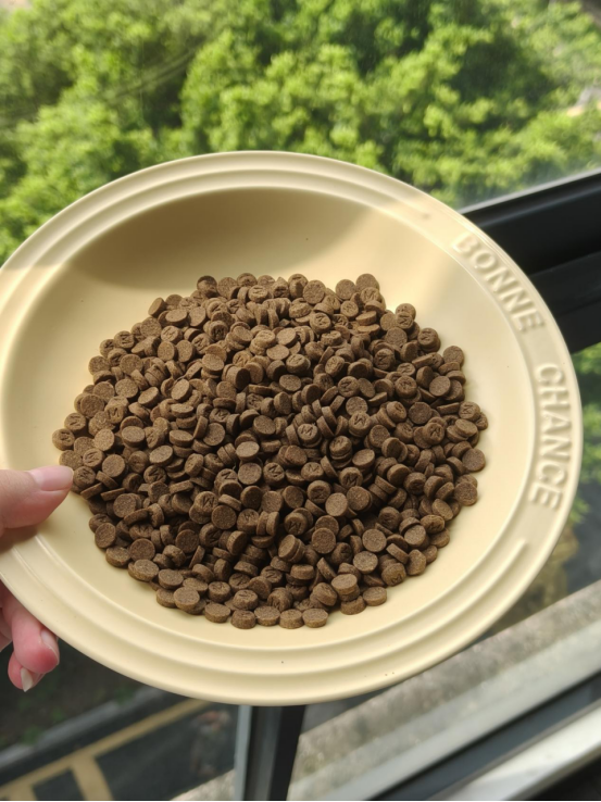 在形态上,这款狗粮的颗粒呈圆形,尺寸较大,直径约 1.1-1.2cm,小型犬食用时需要充分咀嚼;颗粒表面略带油腻感,还包裹着一层冻干涂层。