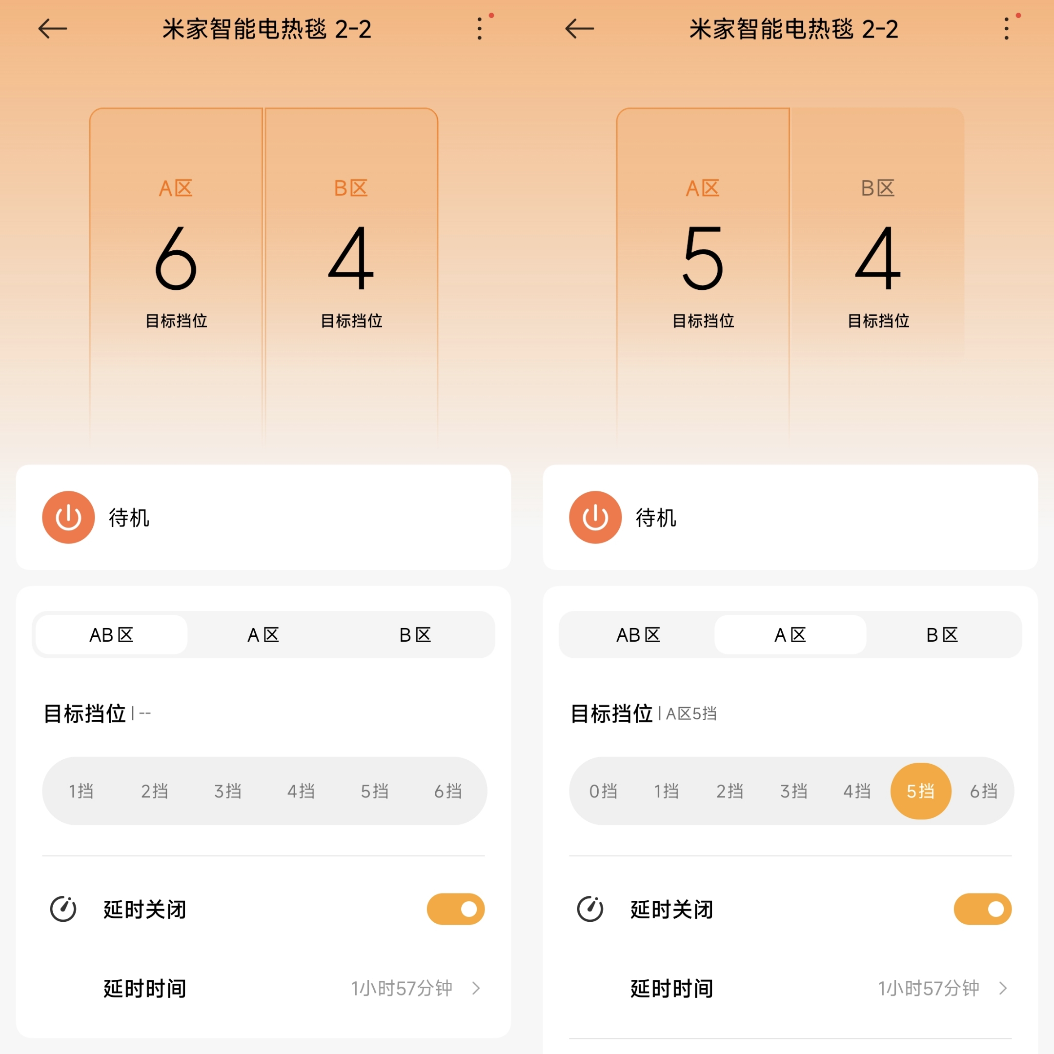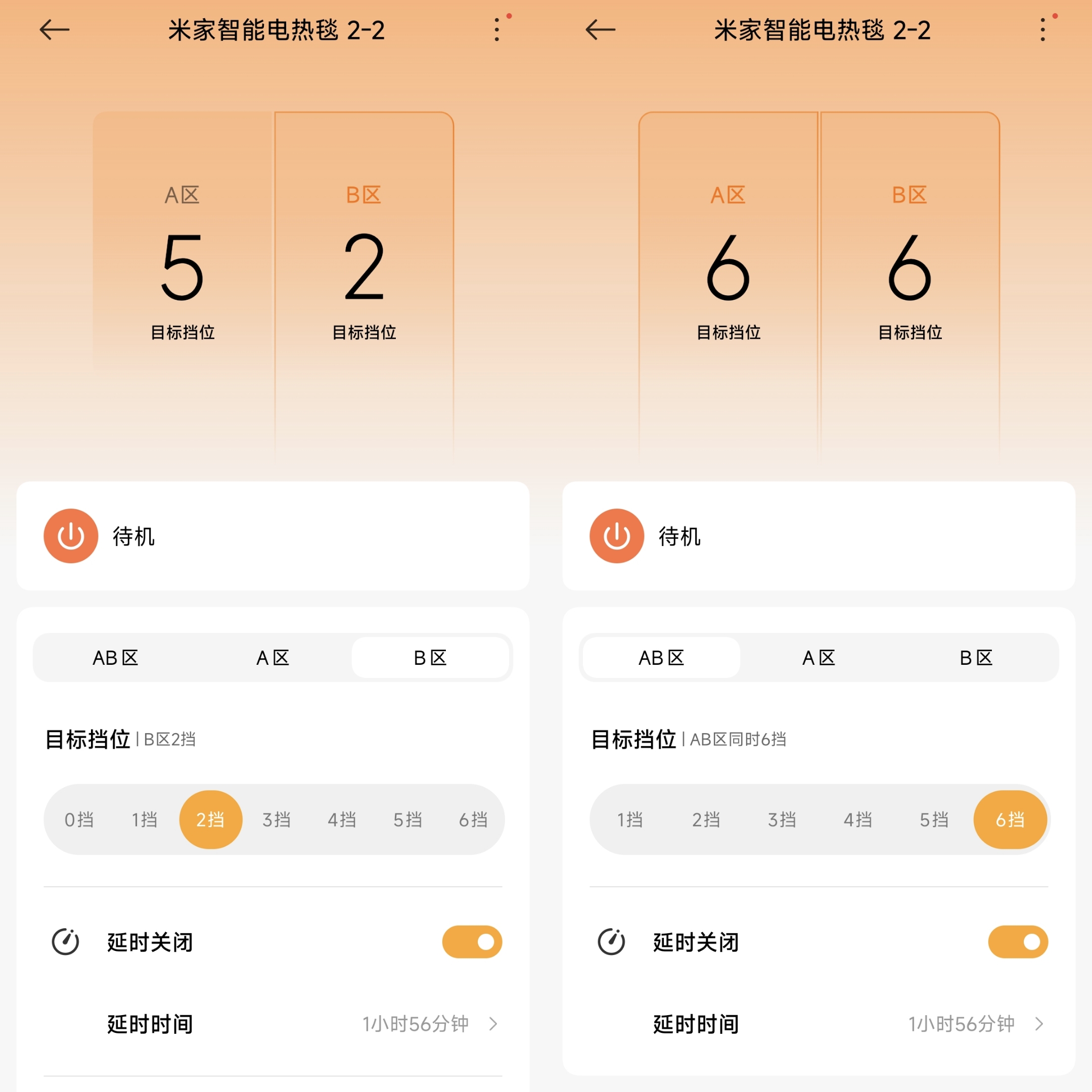 温控方面更是亮点十足,支持AB双区独立加热,左右分区可以按需调节温度,我和老公对温度的需求不一样,他怕热我怕冷,现在他那边调3挡,我这边调5挡,各自都能享受到舒适的温度,再也不用为了温度问题纠结了。总共6挡智能温控,1挡约30°C,6挡约50°C,覆盖了不同场景的使用需求。最贴心的是,入睡后它会自动调温,5、6挡运行1小时后会自动降为4挡,整夜保持恒温,不会因为温度太高而闷得难受。