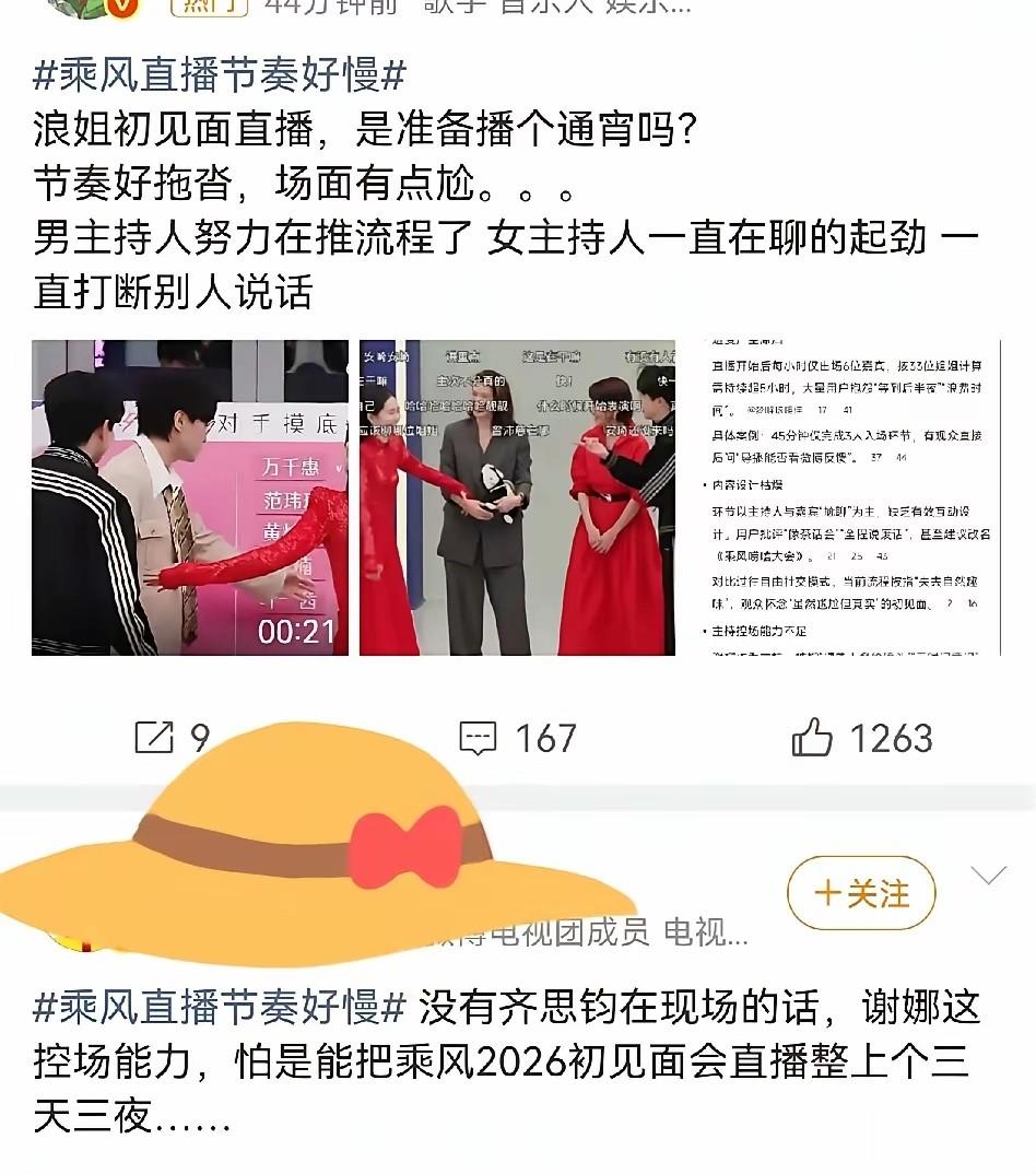 直播节奏慢到离谱,开播一小时仅6位姐姐亮相,平均10分钟一人,33位姐姐按这进度至少播5个半小时,直奔凌晨收场。谢娜全程话多抢镜,遇熟人就疯狂拉家常、给镜头,完全无视时间规则,把专业舞台变成私人茶话会。姐姐们刚要开口就被频繁打断,自主社交镜头全无,满屏都是无效尬聊,毫无看点。