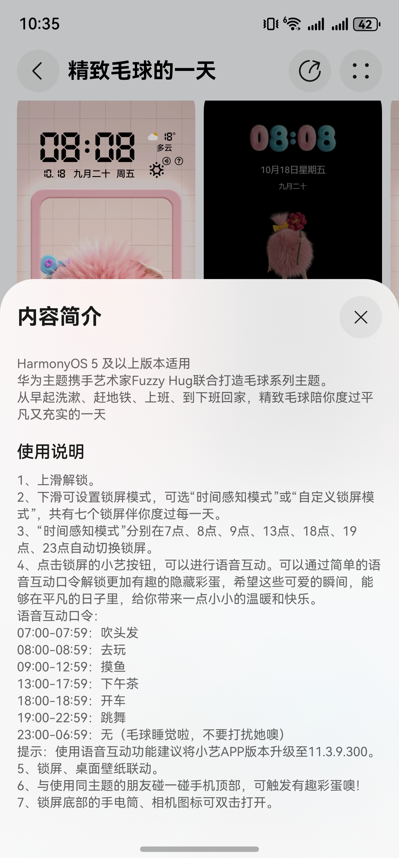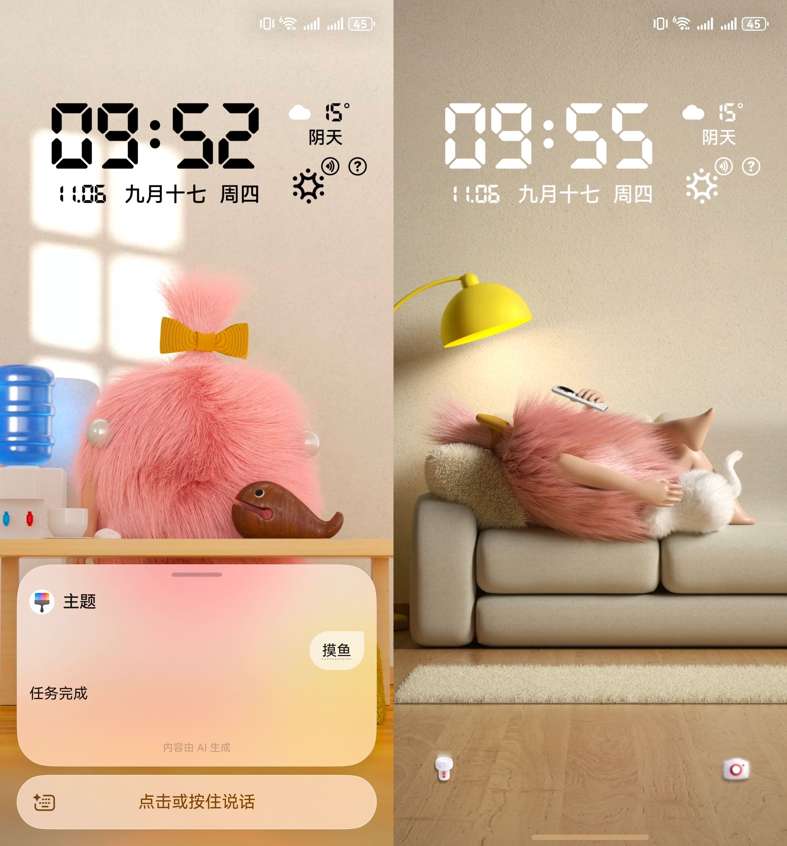 但真正的惊喜,是发现它能和我对话。手机升级到鸿蒙6之后,点击锁屏上的小艺按钮,在通勤路上对它说“吹头发”,它就会开始给自己吹头发,下午上班时提一句“摸鱼”,它也会和你一起上班摸鱼。这种简单的语音互动,让这个毛球瞬间从壁纸变成了一个活生生的电子伙伴。最让我拍案叫绝的彩蛋是晚上,忙碌了一整天后,锁屏上毛球的毛发居然变得油油的!这个细节真实得让我笑出声,简直就是我本人的状态实录。
