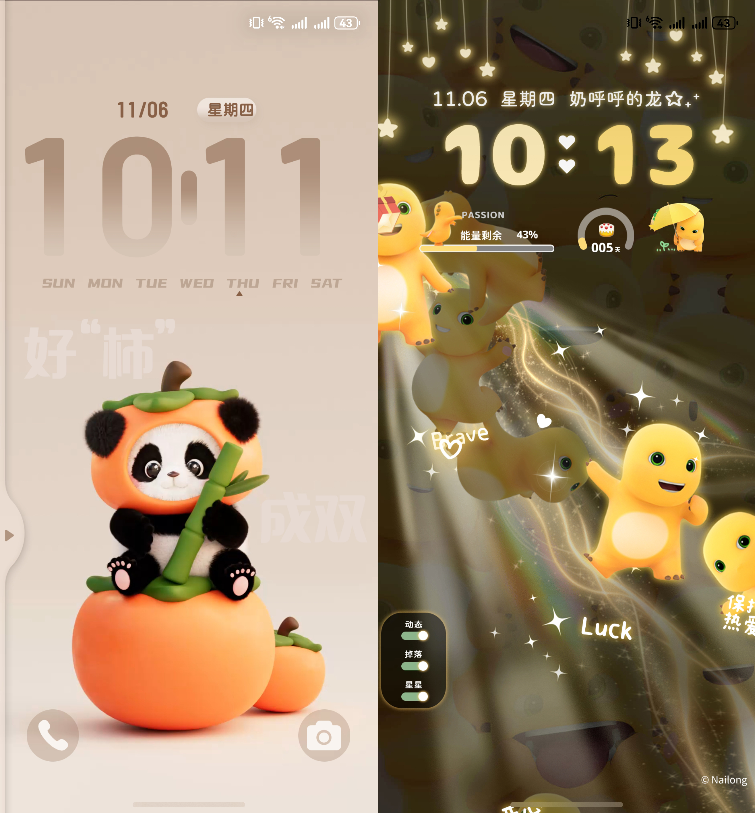当然,我的快乐清单里不止有它。“柿柿如意3D熊猫”里那只软萌的熊猫,每次点击都会举起不同的祝福语,成了我每天必备的幸运签。当然,“奶龙 会发光的你”也很可爱,锁屏界面就布灵布灵的,充电时也有一只可爱的奶龙跳出来。