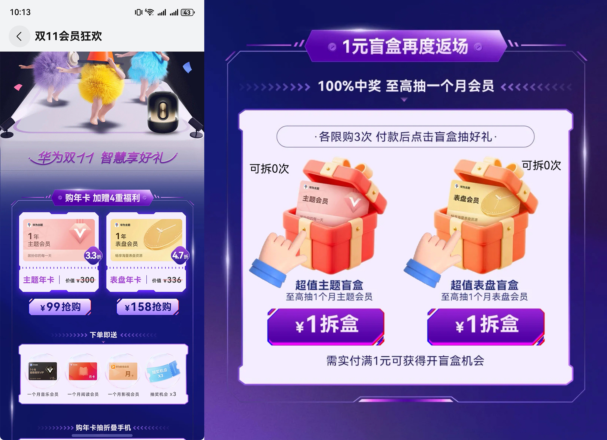 这么一圈玩下来,忍不住想开通会员,全部拥有!正巧赶上双十一,主题会员买年卡能赠4项福利,算下来每天成本几乎可以忽略不计。再加上1元盲盒能抽出超值福利!这种拆盲盒的未知乐趣,甚至让消费行为本身都充满了趣味。甚至还有更超值的:如果你是手表用户,记得去运动健康APP,表盘会员“买1送6”的活动堪称专属彩蛋。运动时换上精致的动态表盘,让你的每一次抬腕注入新鲜动力与仪式感。