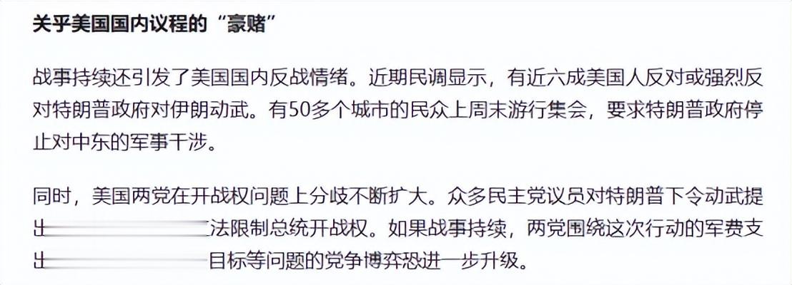 除了麦金尼斯和民众的抗议,还有很多议员也反对这场战争,共和党和民主党的分歧加大,就连特朗普自己的支持者阵营里,也有不少人反对美国深度介入中东冲突,担心重蹈阿富汗战争的覆辙。