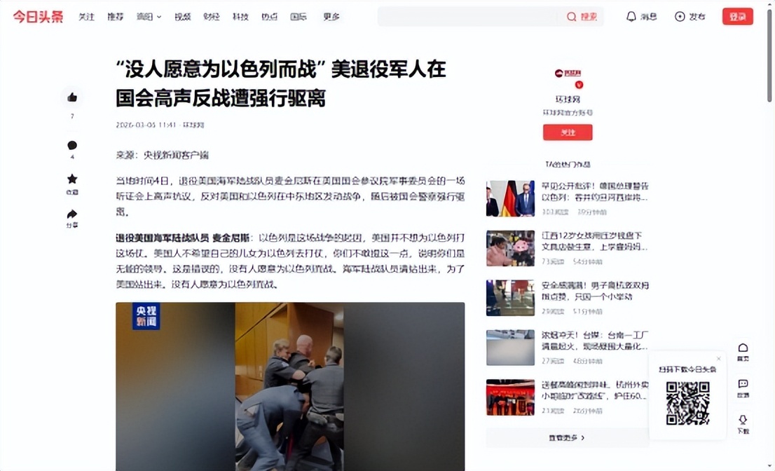 在4日国会举行军事准备情况听证会的时候,麦金尼斯当着一众政客的面高喊“没有人愿意为以色列打仗”“美国不该把自己的儿女送上战场”,还没等他说完,国会警察就冲上前要把他拖出会议室,麦金尼斯勾住门框,想把自己的心里话喊完。