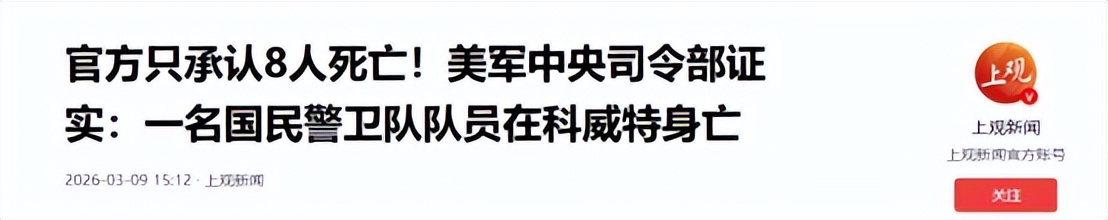 上观新闻2026-3-9官方只承认8人死亡!美军中央司令部证实:一名国民警卫队队员在科威特身亡】