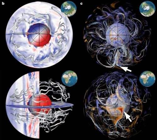 地球磁场是由地球内部流动的熔岩和金属液体的电流所产生的。这个电流产生了一个磁场,类似于一个大型的磁铁。地球磁场的方向通常是朝向地心的北极和南极,但是最近的研究表明,地球磁场的方向正在向西漂移。这个漂移速度约为每年30至40公里。