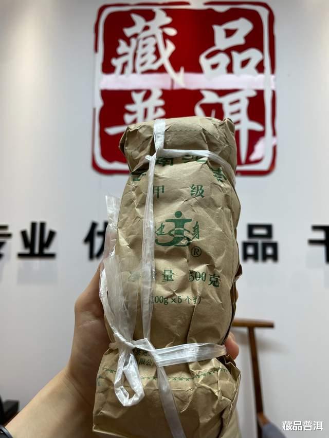 98健身沱为100克/沱,5沱/条,使用牛皮纸袋包装。每个沱茶的包装纸都是80-90年代特有的条纹油光纸,中间是红色健身牌商标,两侧印着“甲级”字样。