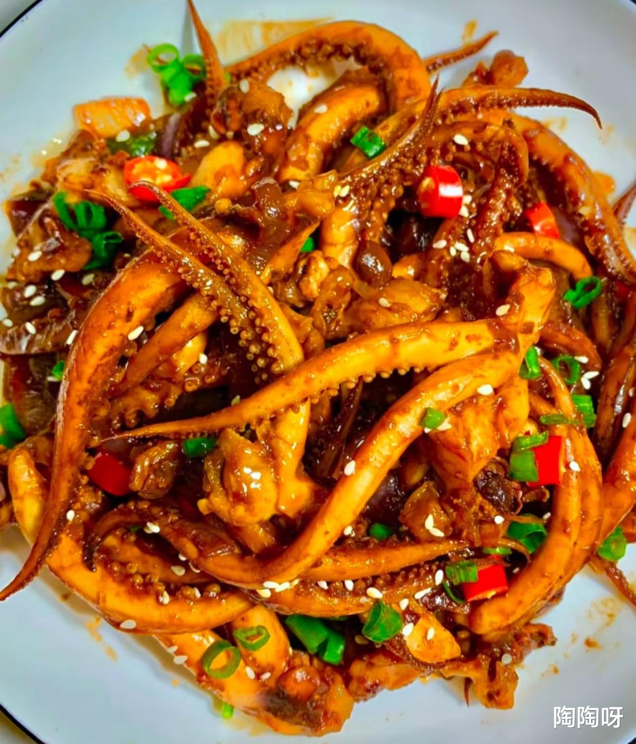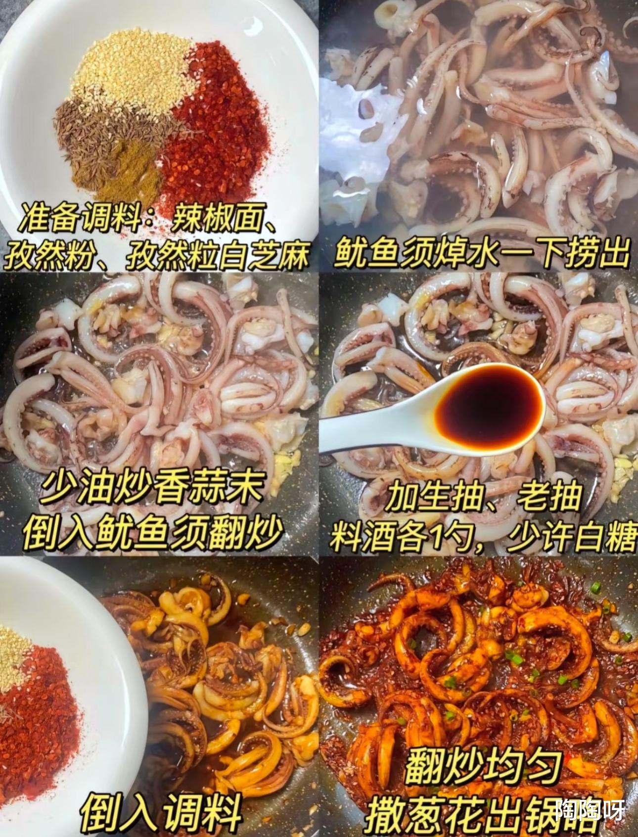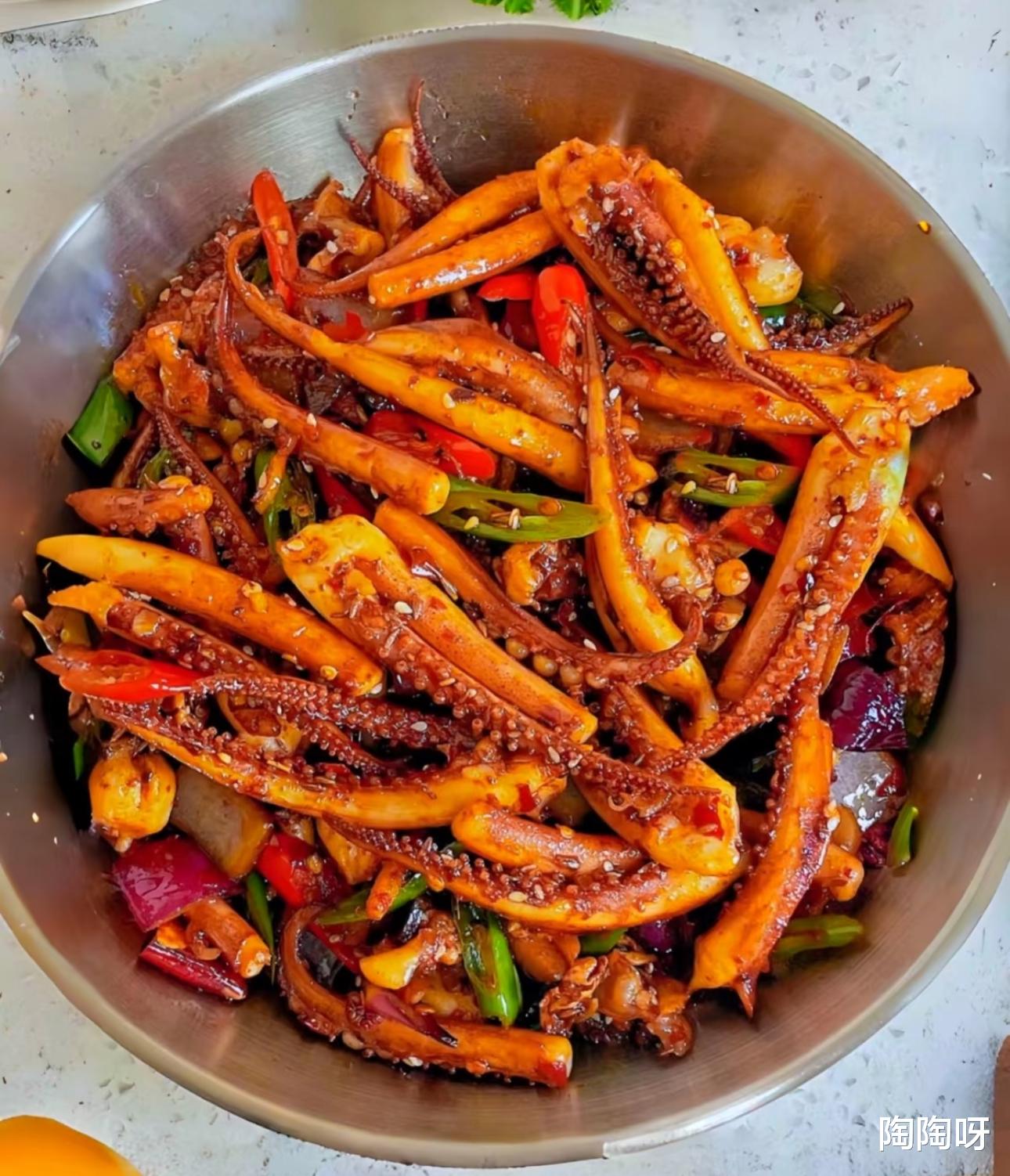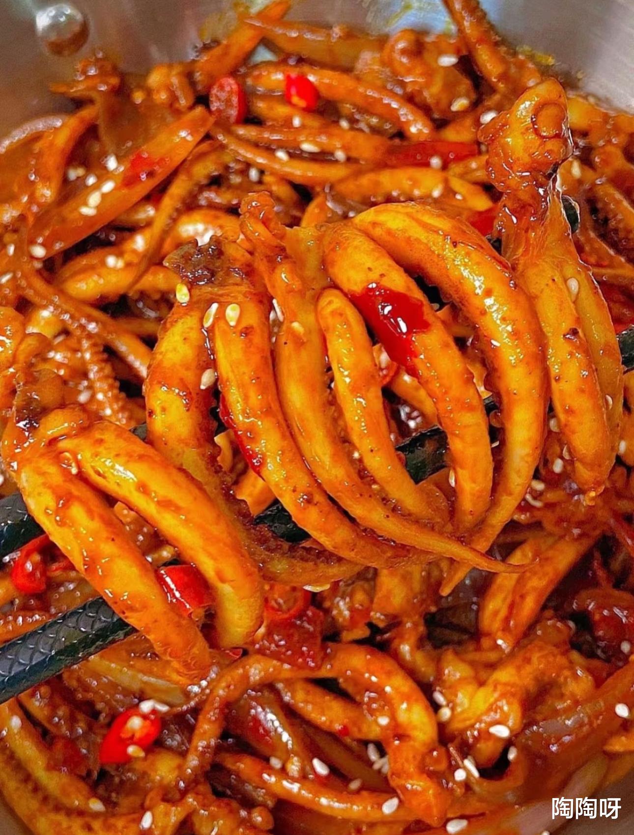 这道香辣孜然鱿鱼须,鱿鱼须Q弹有嚼劲,孜然的香气浓郁,辣椒的刺激让味蕾瞬间爆炸,香辣过瘾,让人一吃就停不下来。