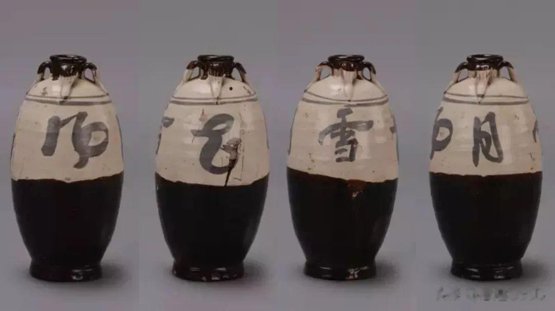 金代磁州窑风花雪月四系瓶,白釉褐彩,青灰胎,小口,卷沿,短颈,溜肩,长弧腹,圈足。颈肩部竖装四系,其下至上腹部施白釉,下腹至底施酱釉,腹部褐彩自右向左书“风花雪月”四字行草。