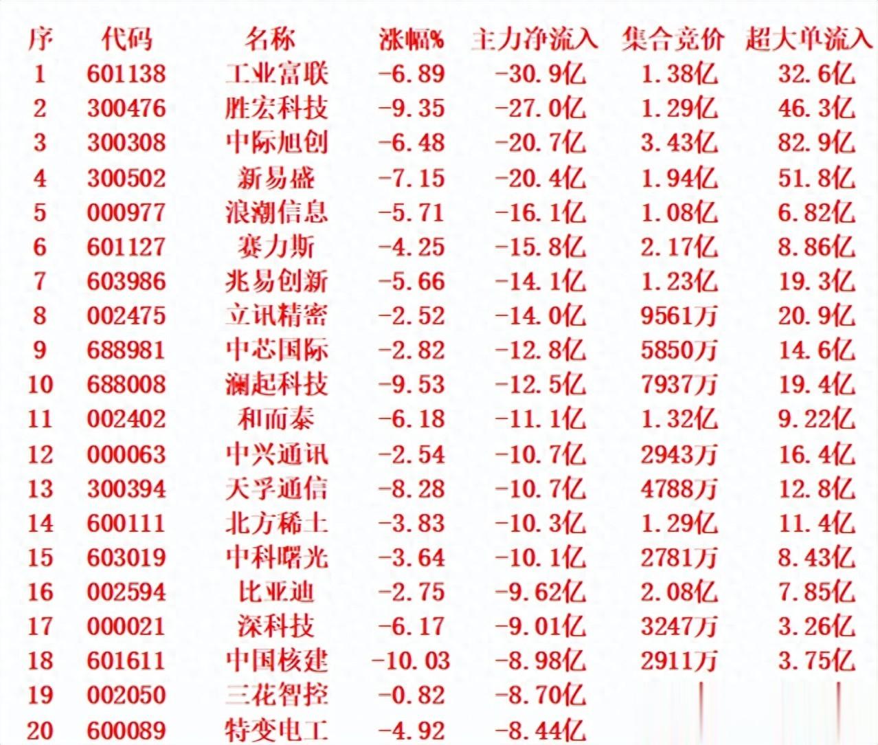 尾盘30分钟,主力资金大幅卖出的名单汇总: