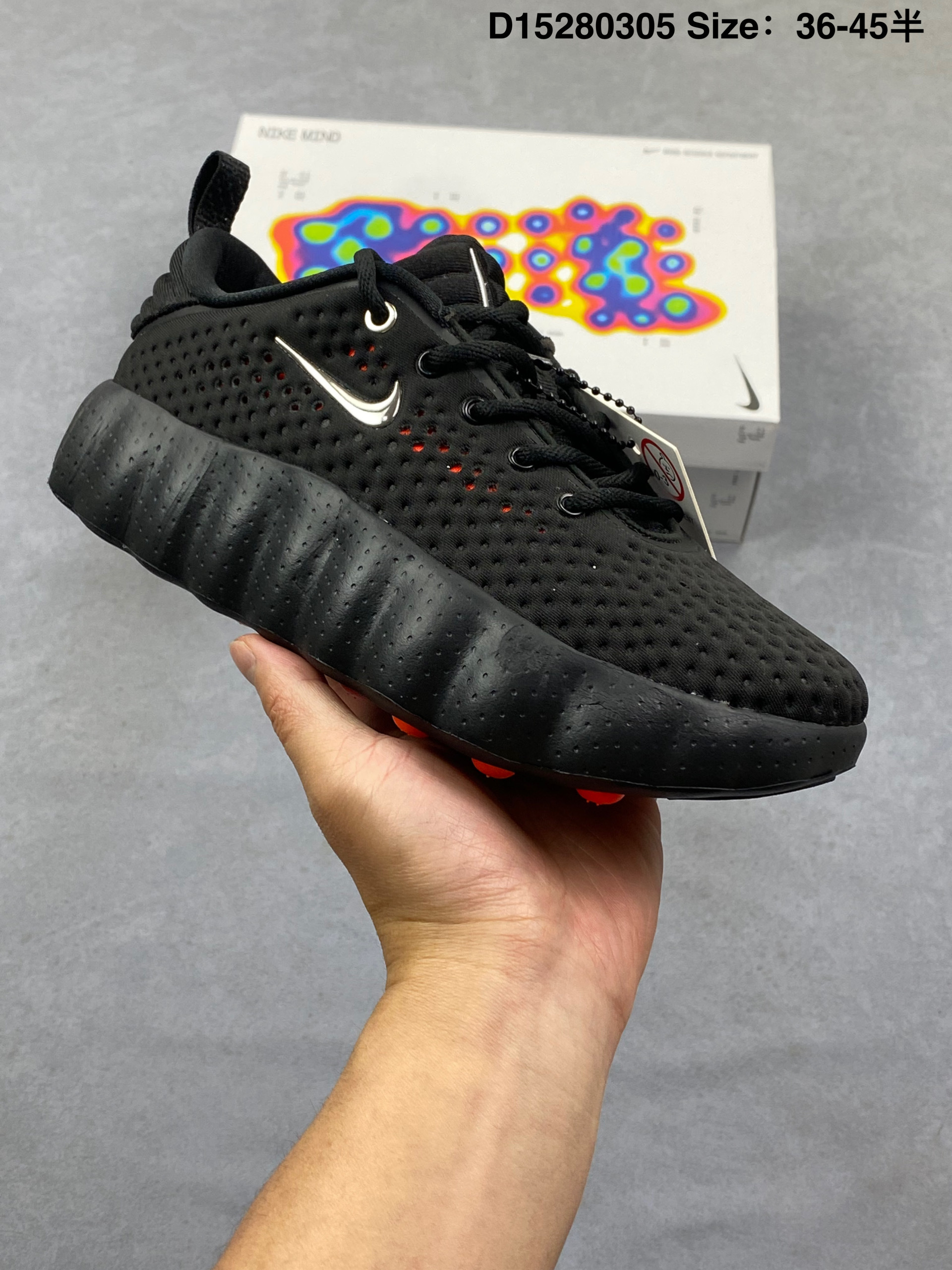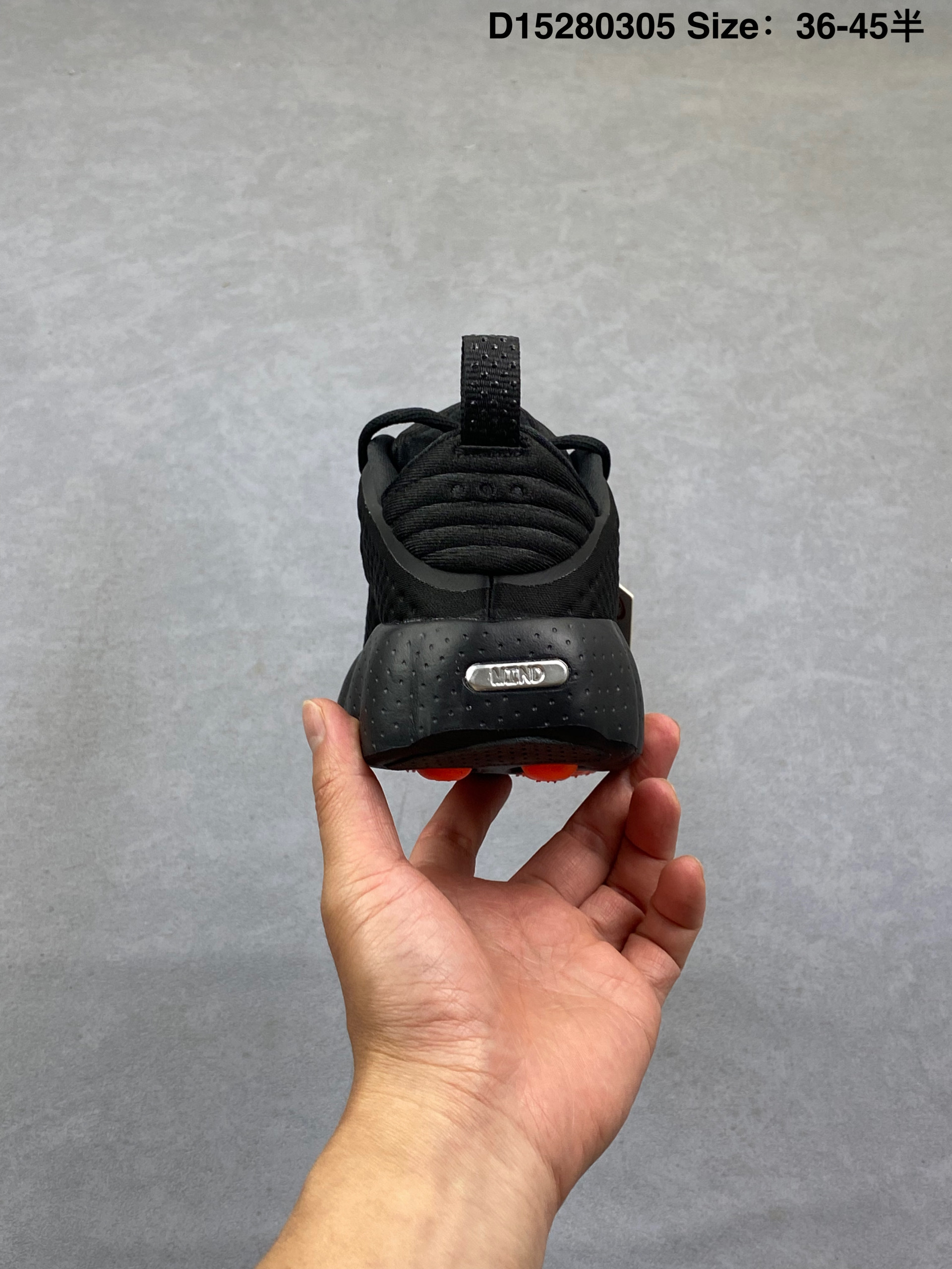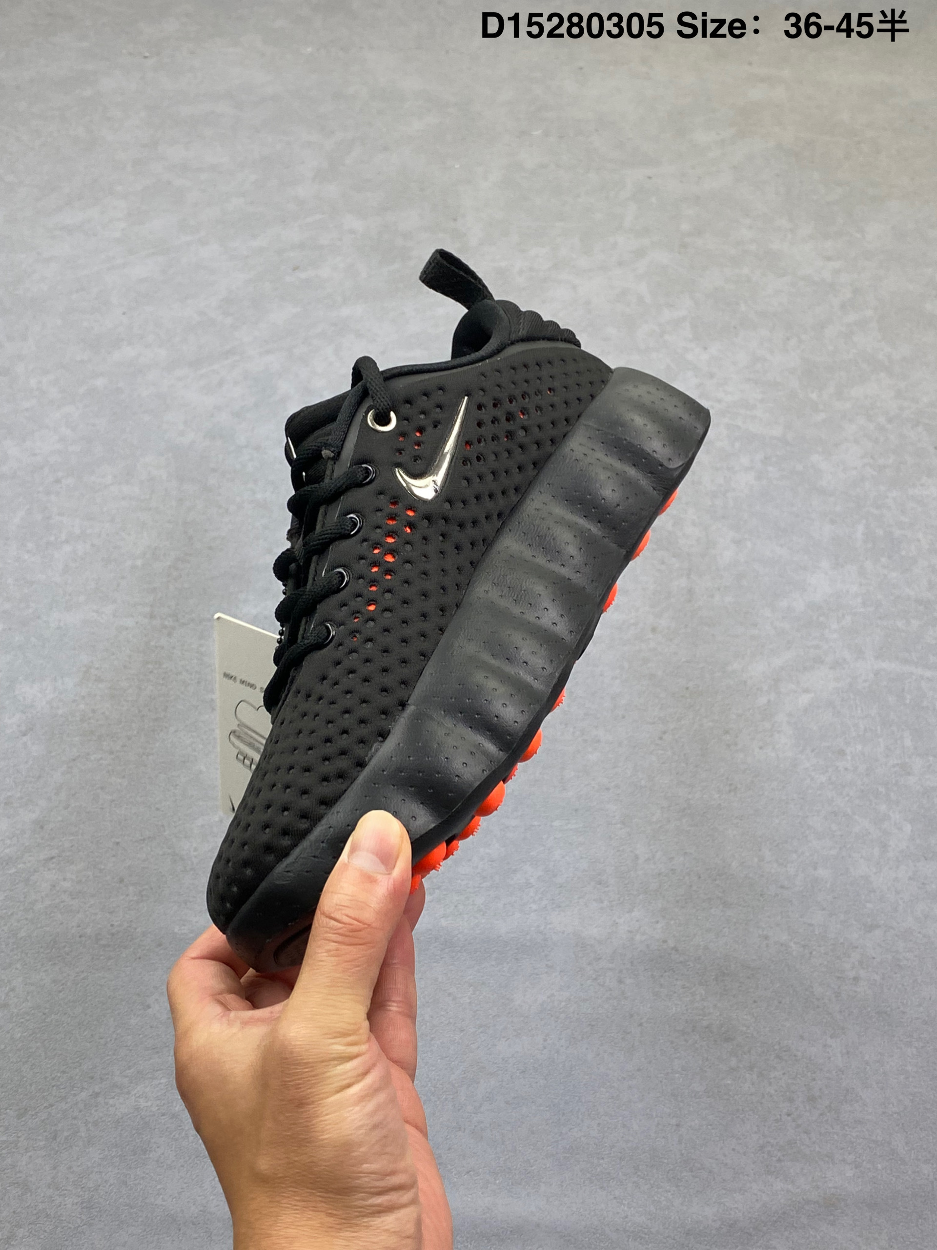 Nike Mind 002 耐克 黑色 黑橙色 足底按摩鞋专为室内外综合训练打造 整体以黑色为主,鞋面是穿孔的透气材质,侧面装饰着闪亮的金属铬迷你Swoosfh Logo,简约中带着亮点,后跟做了分层褶皱设计,还压印有精致的"Mind"字样铭牌,细节质感直接拉满,从Mind 001到Mind 002,这双鞋最特别的就是鞋底藏着22个独立泡棉节点,看起来科技感满满。此外,鞋垫左脚印"Nike Mind",右脚印"Science Departmenth"细节直接拉满。