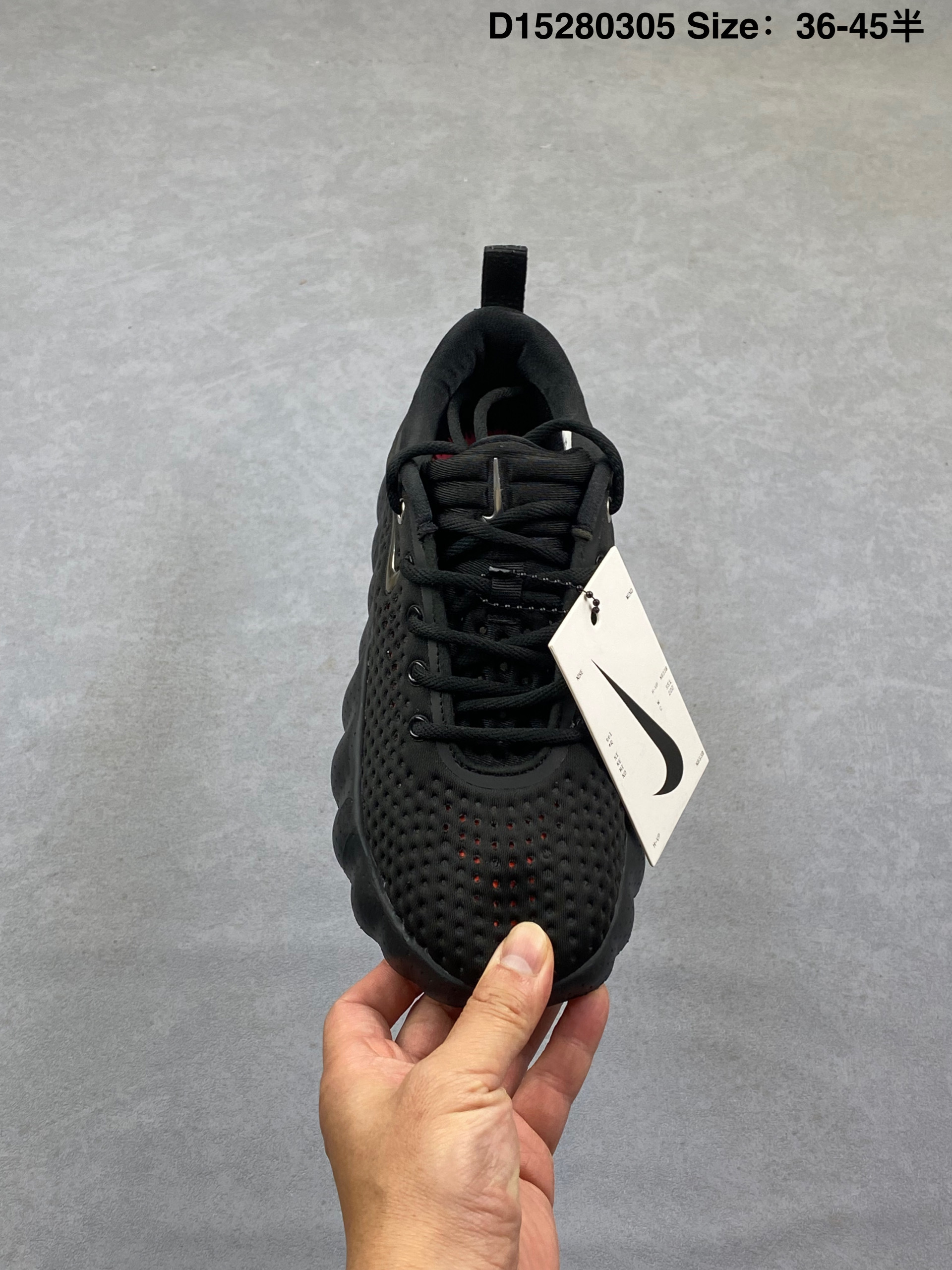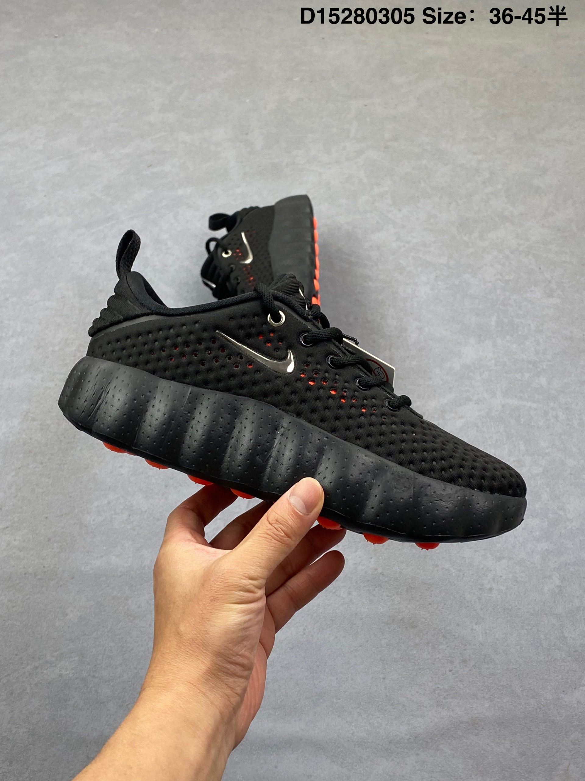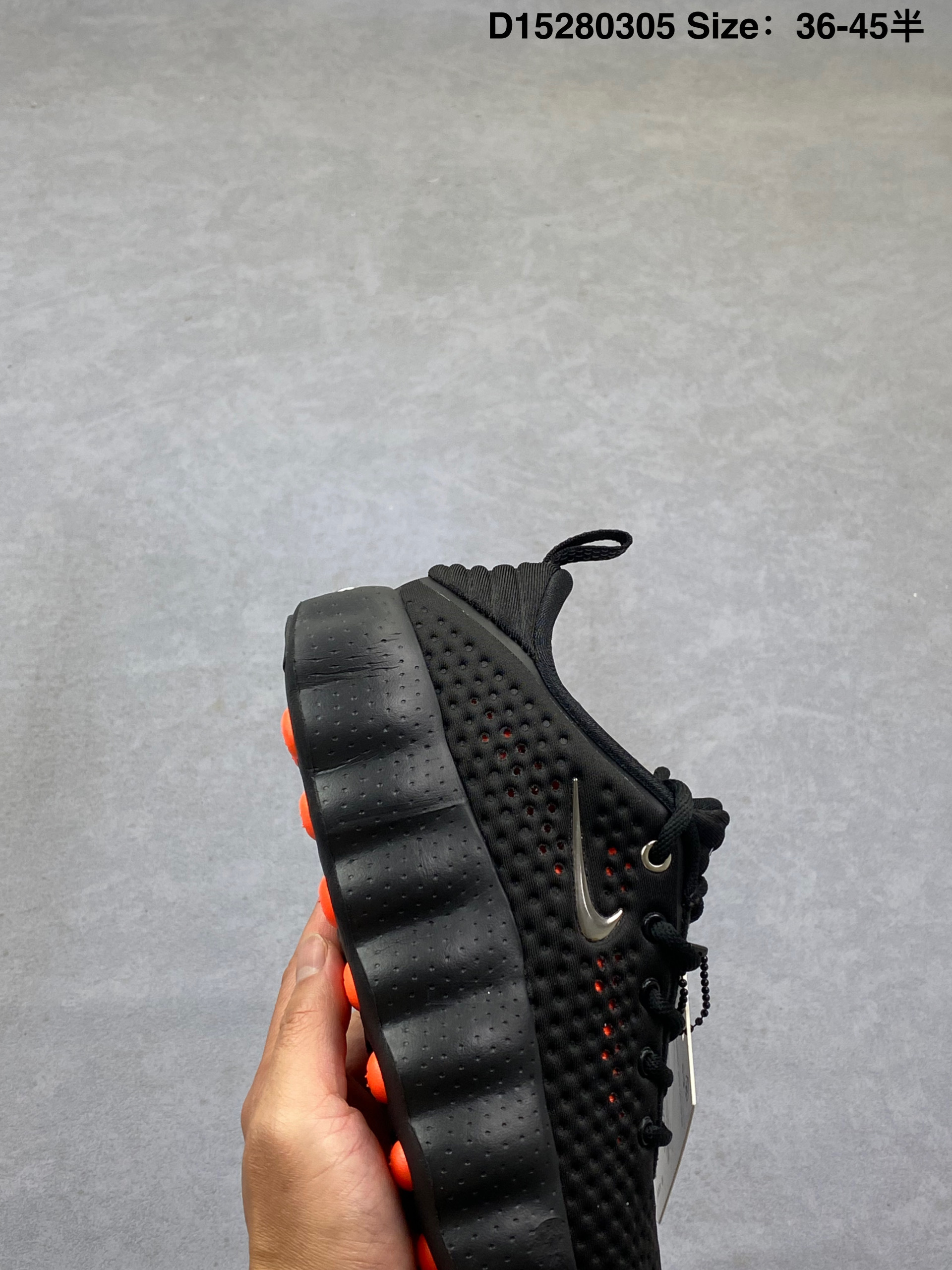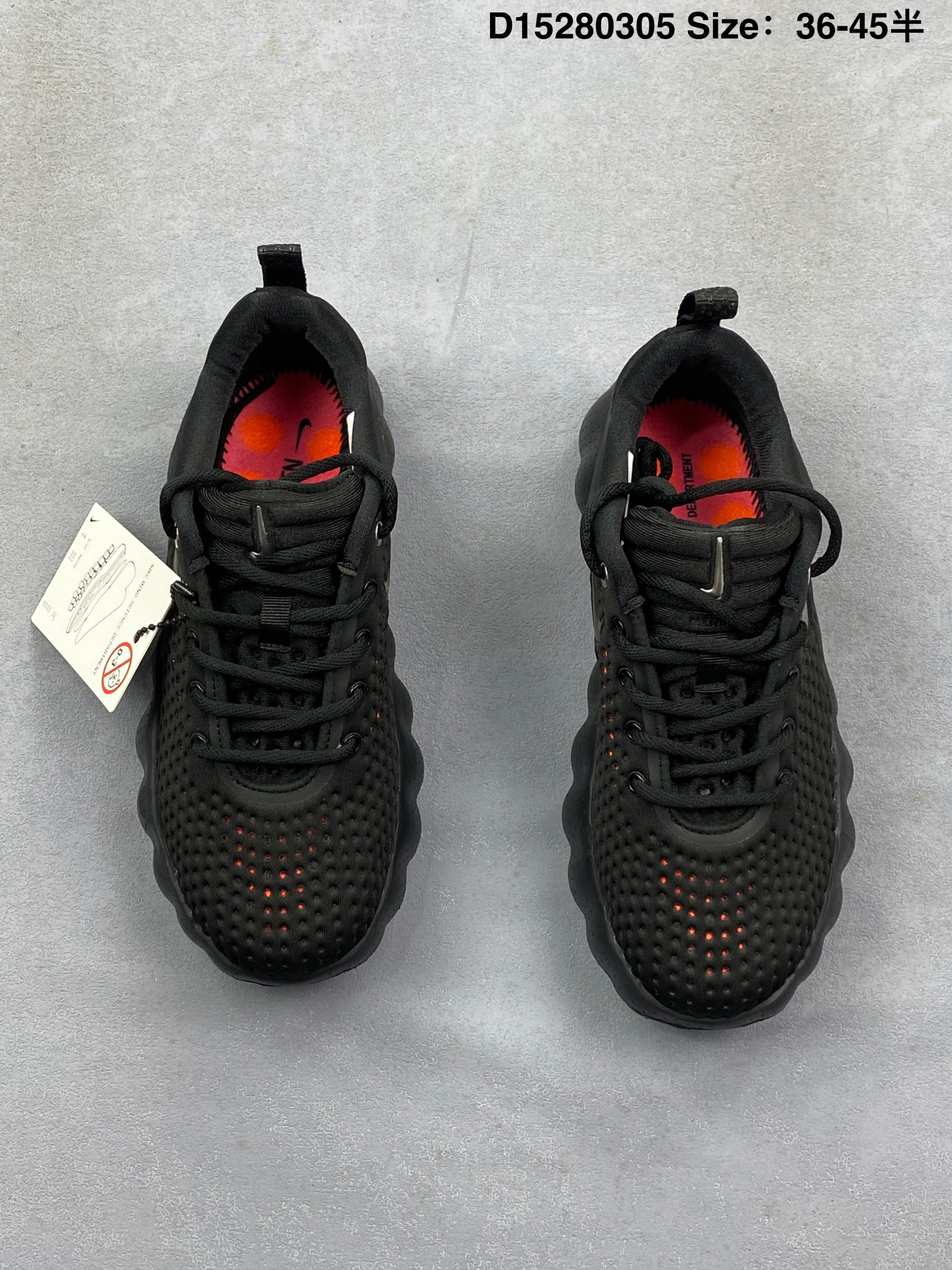 Nike Mind 002 耐克 黑色 黑橙色 足底按摩鞋专为室内外综合训练打造 整体以黑色为主,鞋面是穿孔的透气材质,侧面装饰着闪亮的金属铬迷你Swoosfh Logo,简约中带着亮点,后跟做了分层褶皱设计,还压印有精致的"Mind"字样铭牌,细节质感直接拉满,从Mind 001到Mind 002,这双鞋最特别的就是鞋底藏着22个独立泡棉节点,看起来科技感满满。此外,鞋垫左脚印"Nike Mind",右脚印"Science Departmenth"细节直接拉满。
