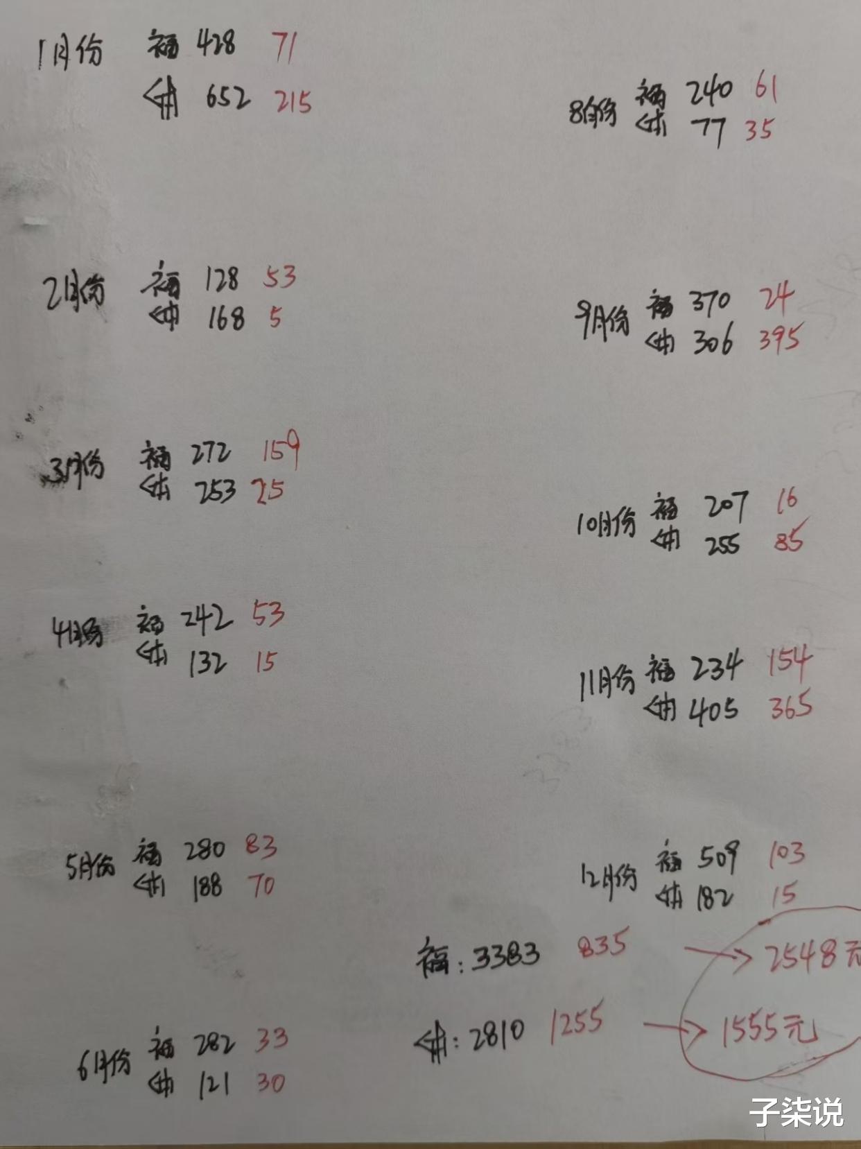 最后汇总统计,全年福彩总共支出了3383元,中了835元,亏2548元!