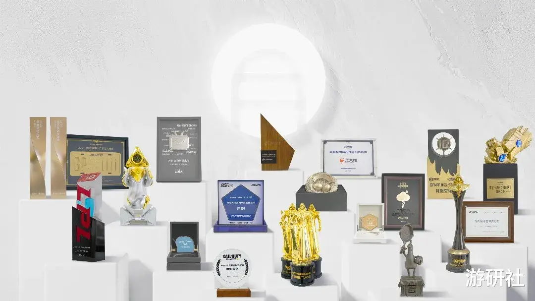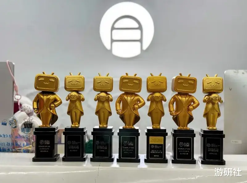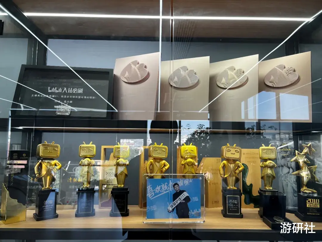 这样的布置,在游戏相关的公司里并不罕见。但在月退的玻璃展柜中央,有一排东西是其它公司里很难看到的:足足七座B站百大UP主的“小金人”。它们和其他奖牌奖杯放在一起,像一排不太需要解释的时间戳。