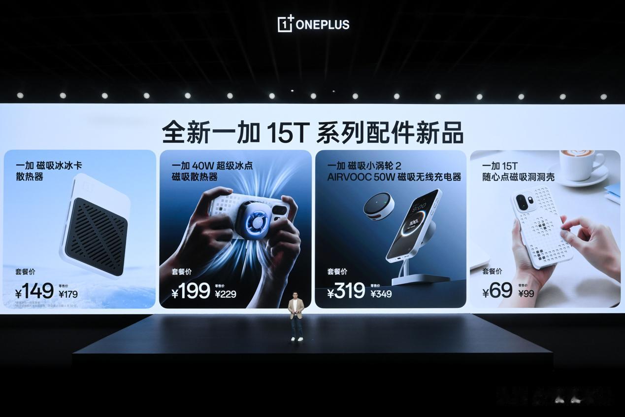 本次发布会上,一加还带来了一系列“又小、又强、又帅、又好玩”的全新专属配件:包括全行业首创的超薄磁吸风冷散热器「一加磁吸冰冰卡」、拥有市面最高 40W 功率的「超级冰点磁吸散热器」、新增桌面支架与多模式调节的「小涡轮 2 代」磁吸无线充,以及质感十足的专属配色「洞洞壳」。以上配件与手机搭配购买,均可享受立减 30 元的套餐专属优惠。