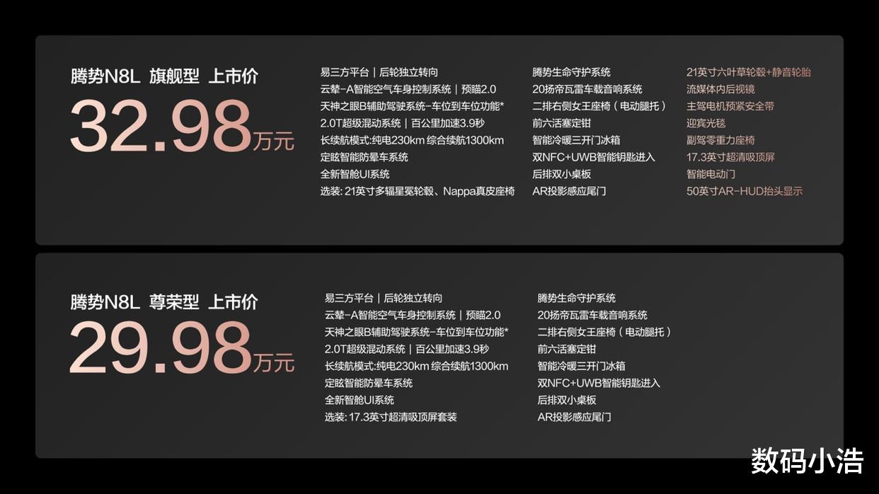 10月28日,腾势N8L正式上市,这款大六座安全豪华SUV推出两款车型,指导价29.98 万-32.98 万元,性价比直接拉满。