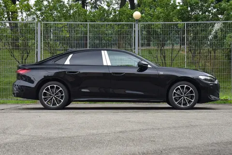 侧面线条干净利落,一条腰线从头贯穿到尾,肌肉感十足。溜背式车顶从B柱开始自然下滑,既保留了轿跑的帅气,也没牺牲后排头部空间。无框车门+半隐藏门把手可以降低风阻系数,在北方冬天也减少被冻住的尴尬。车尾的贯穿式OLED尾灯是亮点,刹车时呈现出有节奏的“呼吸”效果,夜晚看起来特别醒目。微微上翘的扰流板和溜背线条很搭,双边排气布局加上黑银后包围,简洁有力。