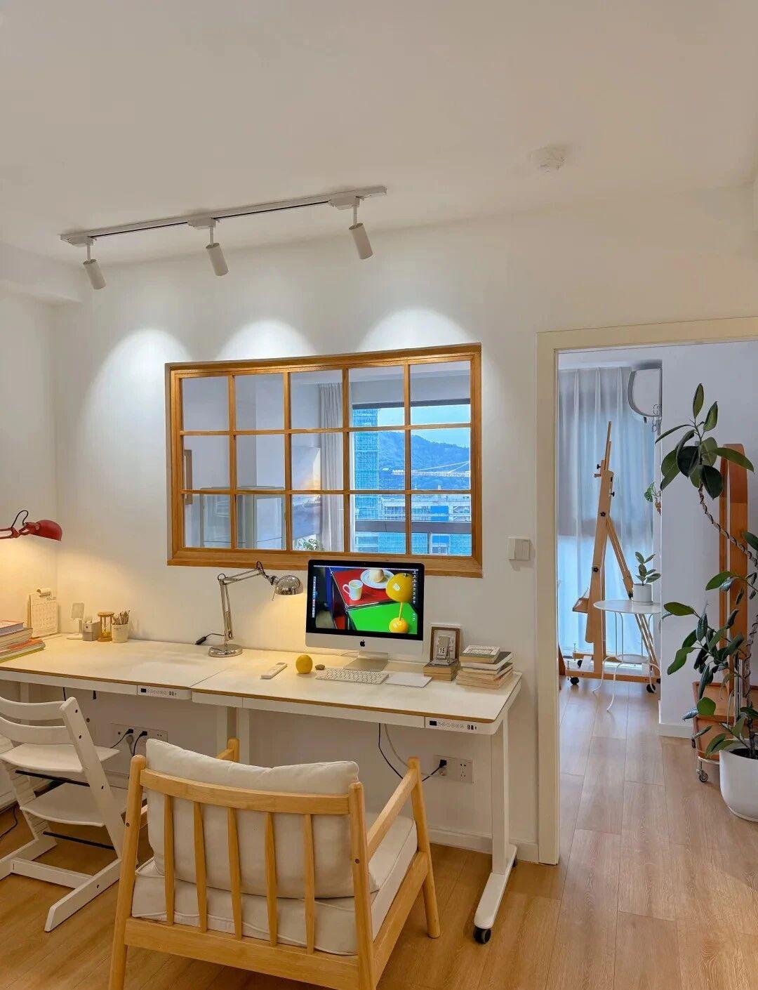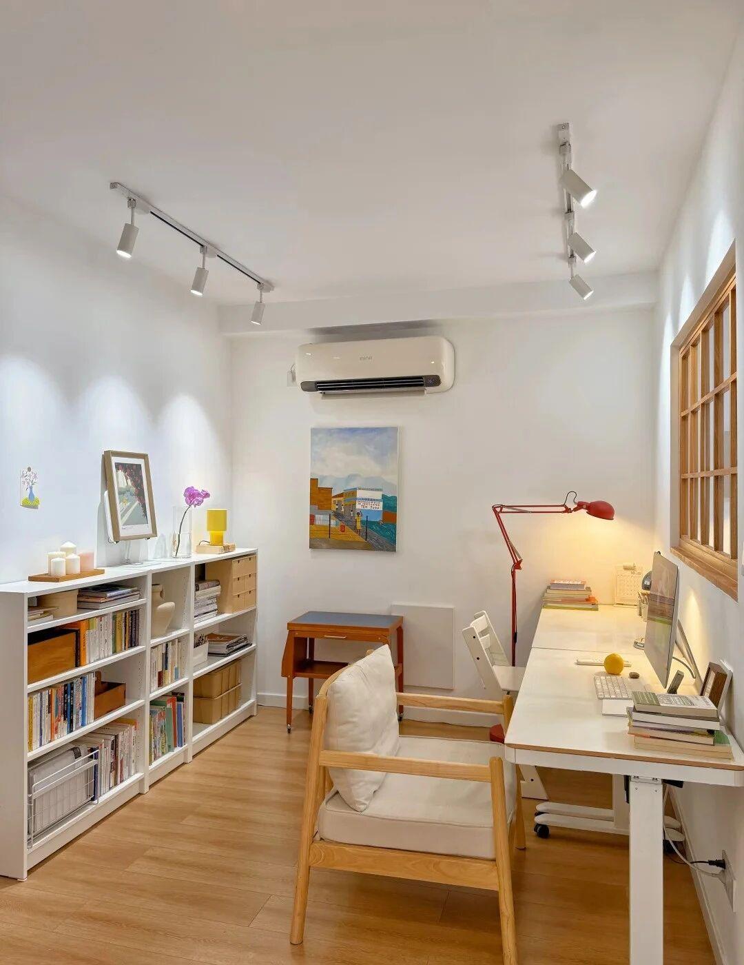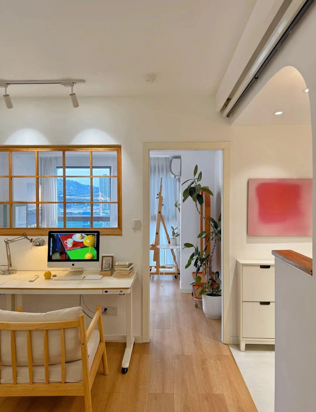 当然,个别区域也做了隔断,以书房为例子,博主特别安装了一个带半墙木窗的隔断,空间感直接翻倍,采光却一点都不会打折扣,每次朋友来都要夸:怎么这么温馨!