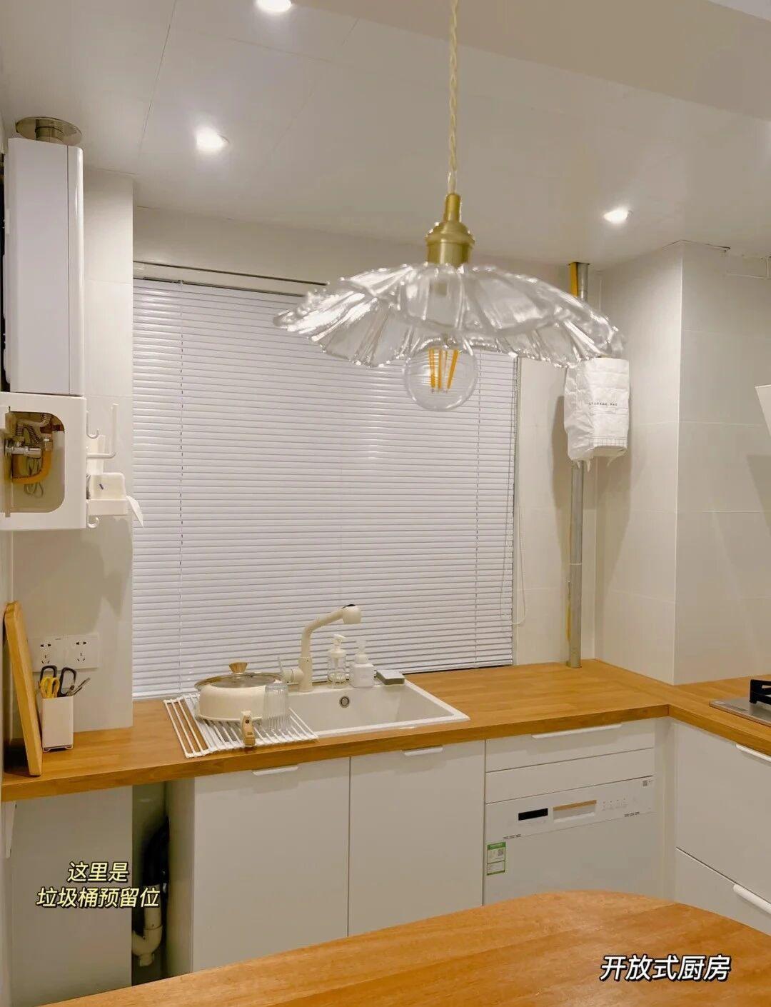 就连厨房也是选择开放式的,靠墙定制了一组L型橱柜,奶油风墙壁、天花做了吊顶,还安装了筒灯,简简单单;