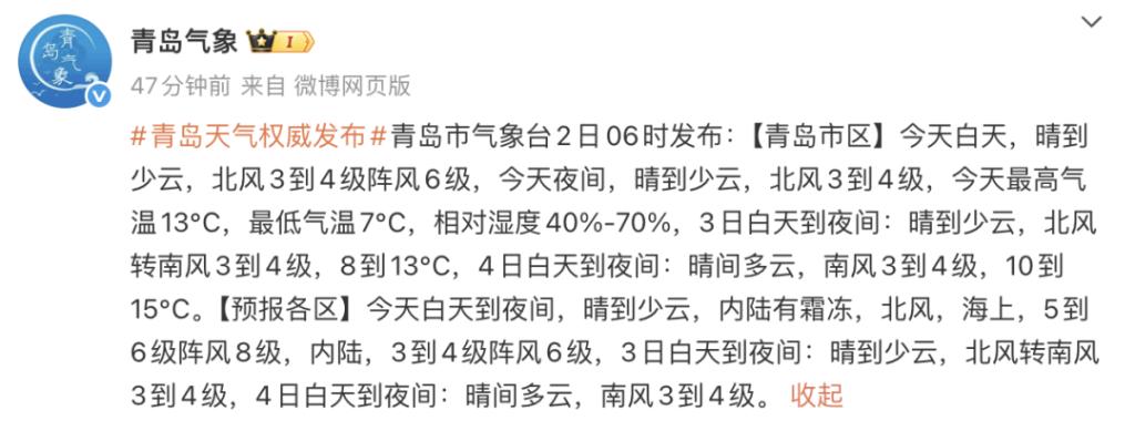 【青岛市区】今天白天,晴到少云,北风3到4级阵风6级,今天夜间,晴到少云,北风3到4级,今天最高气温13℃,最低气温7℃,相对湿度40%-70%。