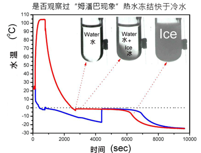 答:你所提到的现象被称作“姆潘巴效应”,可以简单地表述为“热水比冷水更容易结冰”。不过这本身还是一个并未完全解决的开放问题,不但对其机理的描述各有千秋,甚至连这个效应是否真实存在都还有一定的争议。支持者提出的可能机理有是其中杂乱无章的杂质,每一种杂质都能在特定温度下触发冻结机制,促使冰晶形成,其中核化温度最高的杂质决定了水的冻结温度,如果热水的核化温度比冷水高5°C,就会明显地观察到姆潘巴效应;并且迅速冷却的水是一个非平衡系统,复杂的非平衡行为可能会导致其冷却“路径”的不同从而表现为冷却速度的差异。用牛顿力学的例子来打个比方,就是高温的水像一个走最速降线的初始位置更高的物体,低温的水像初始位置较低但是路径耗时比较长的物体,我们可以观察到更高的物体却最先落地这一“反常现象”。而且,温度计摆放位置的不同,都会导致错误地“证实”姆潘巴效应。