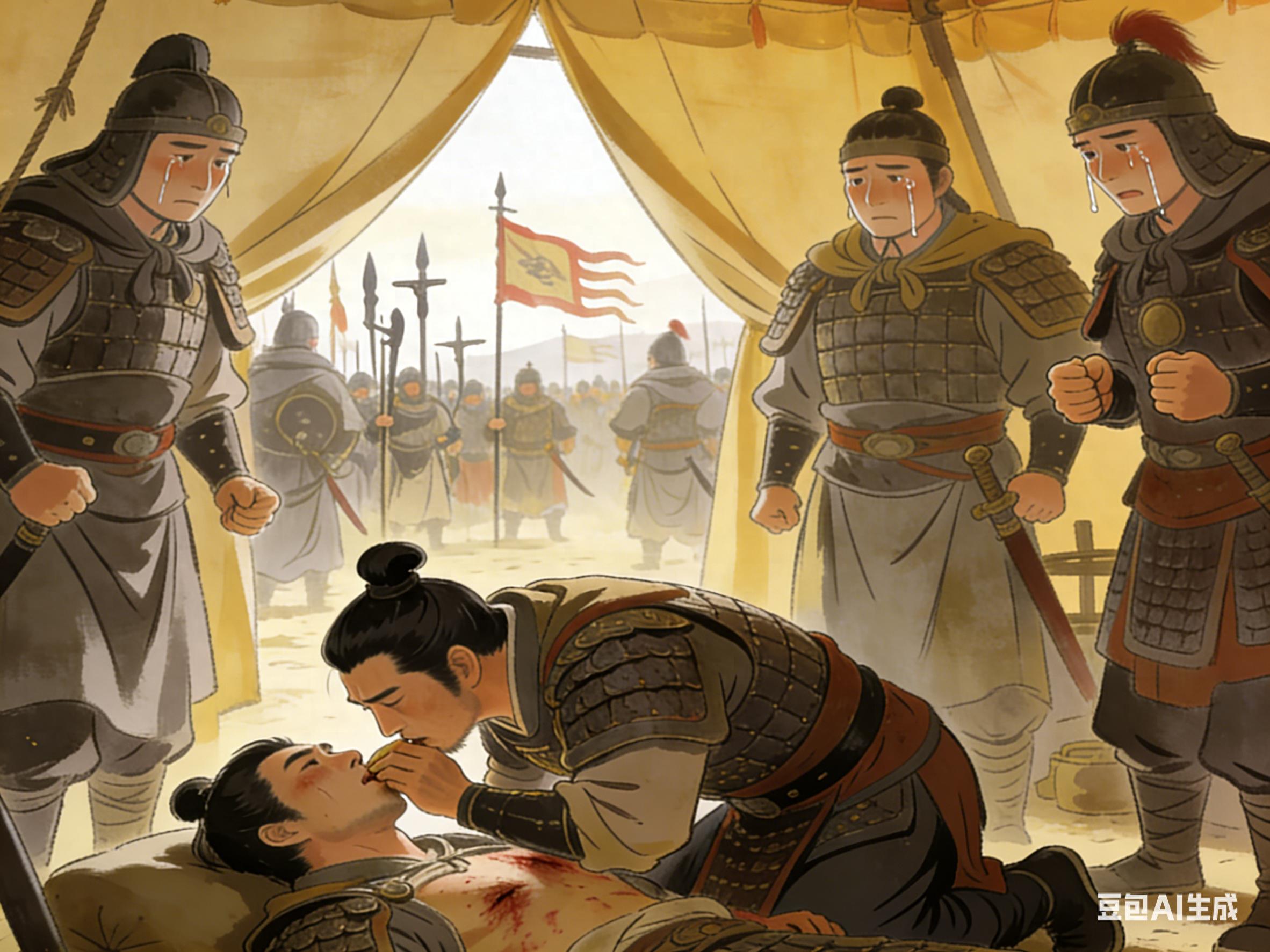 一般将领更做不到的是,有一次一个士兵身上长了毒疮,流脓不止,吴起二话不说就蹲下来,用嘴帮士兵把脓吸了出来。