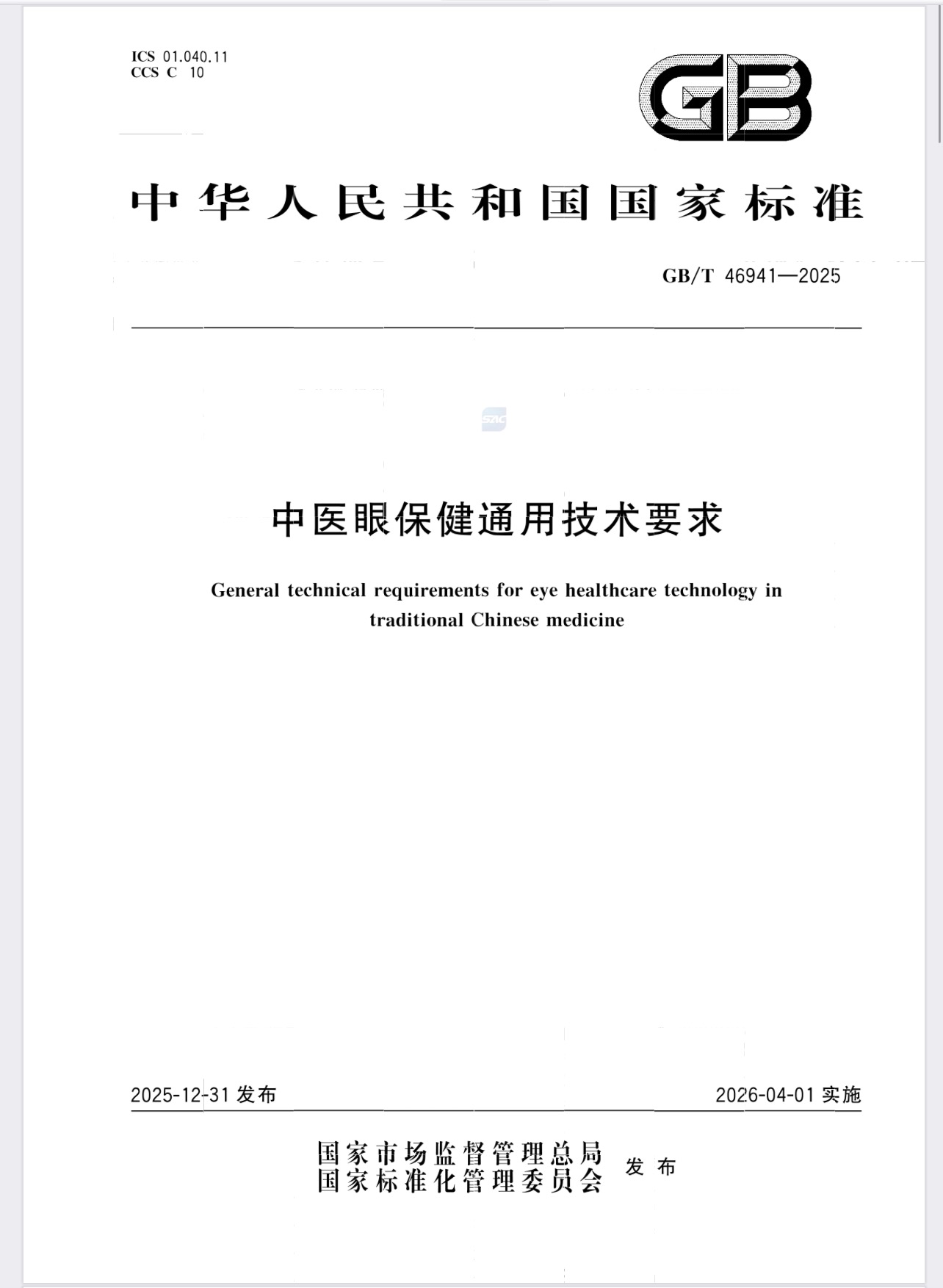 近日,由亢泽峰教授团队、王宁利教授团队牵头研制的《中医眼保健通用技术要求》(GB/T46941-2025)于2025年12月31日正式发布,将于2026年4月1日起实施。