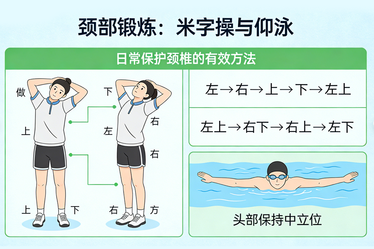 2、科学锻炼强肌群。加强颈肩部肌肉力量,是保护颈椎的“主动防御”。可常做“米”字操,用头缓缓写“米”字,但速度要慢,幅度要小。游泳,特别是仰泳,能有效锻炼颈背力量,是极佳的运动选择。