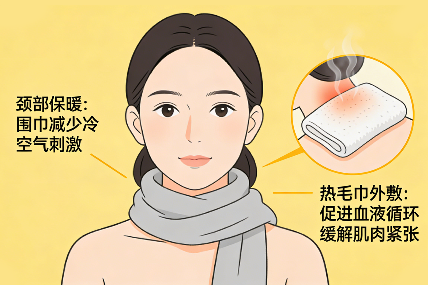 3、防寒保暖莫轻心。颈部受寒易致肌肉痉挛,加重不适。在空调房内,可备一条围巾或披肩,为颈部保持温暖。若已感酸胀,可用热毛巾外敷,促进局部血液循环,缓解紧张。
