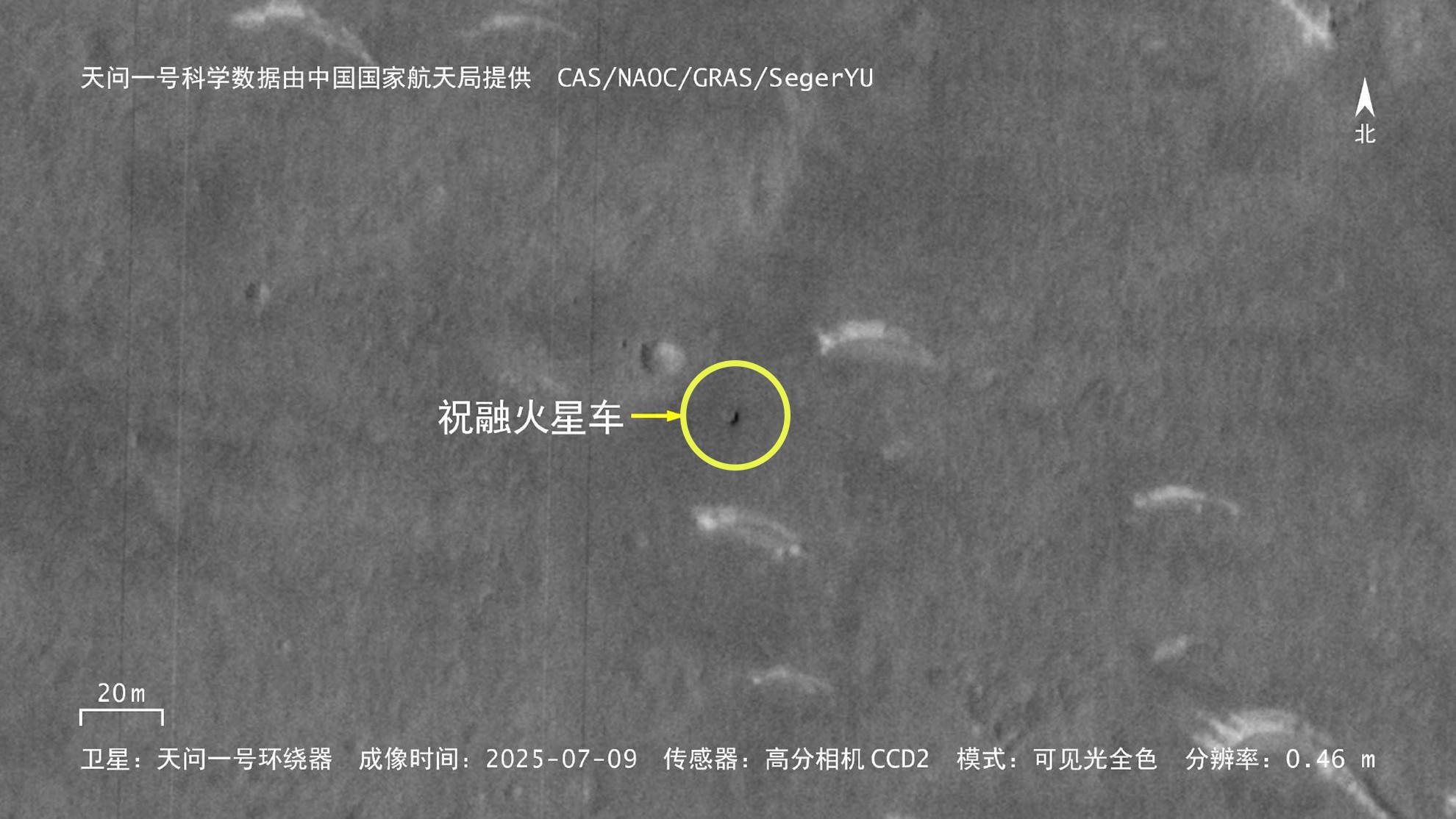 我国祝融号火星车有最新照片了!根据中国国家航天局(CNSA)公布的新一批科学数据,天问一号轨道器的高分辨率相机在2025年7月,对祝融号所在的区域进行了一次成像,拍摄到了目前为止已知最新的祝融号照片。