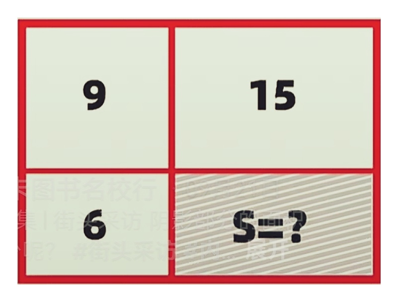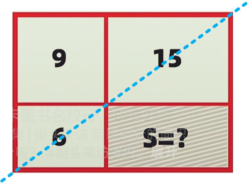 题目是这样的:一个矩形用两条线分为了四个格子,其中三个格子的面积分别是9、15、6,求阴影部分的面积,并给出正确的求解过程。