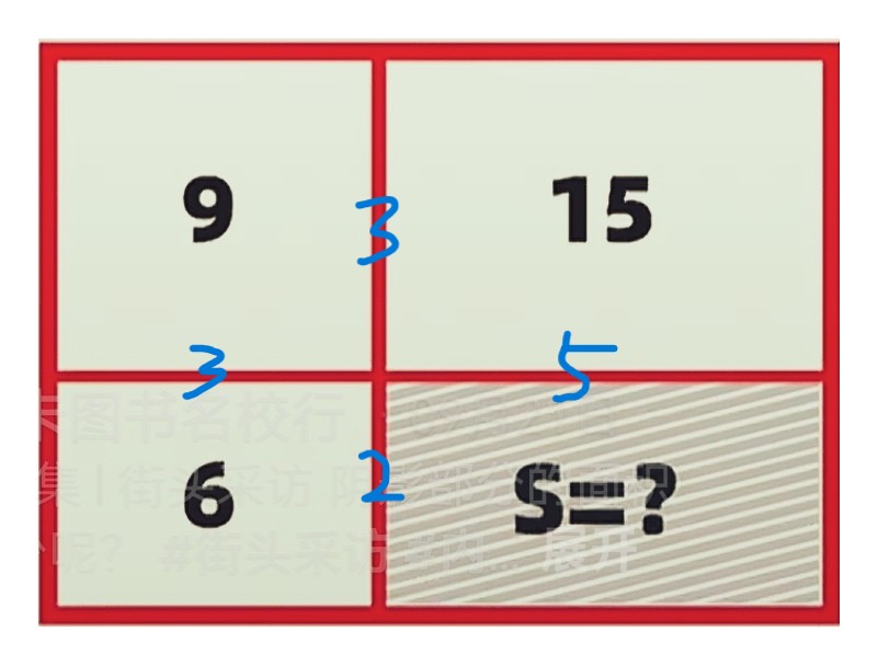 二是,上下两个半边或左右两个半边,其各自两个格子面积之比相同,都是中间分割线段两段的比值。所以答案也很容易计算。