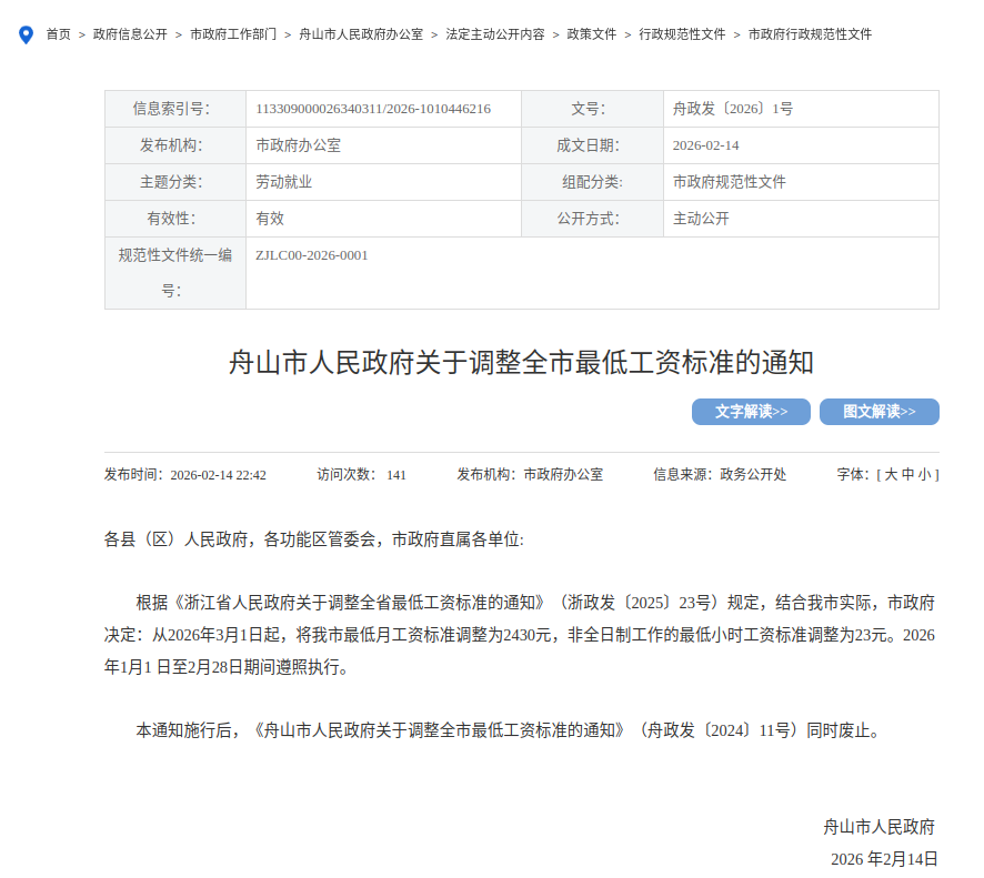 从2026年3月1日起,月最低工资标准由原来的2260元调整为2430元,全日制工作的最低小时工资标准调整为23元。
