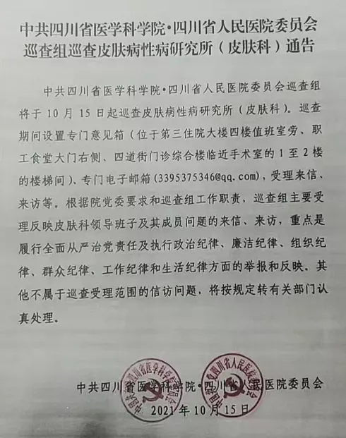 2021年10月15日,中共四川省医学科学院·四川省人民医院委员会巡查组专门巡查皮肤病性病研究所(皮肤科)通告引起关注,根据院党委要求和巡查组工作职责,巡查组主要反映皮肤科领导班子及其成员问题的来信、来访,重点是履行全面从严治党责任及执行政治纪律、廉洁纪律、组织纪律、群众纪律、工作纪律和生活纪律方面的举报和反映。科室主任负责最大,涉及到的问题也最多。多位知情人士认为目标明确,巡视目标为沈柱。