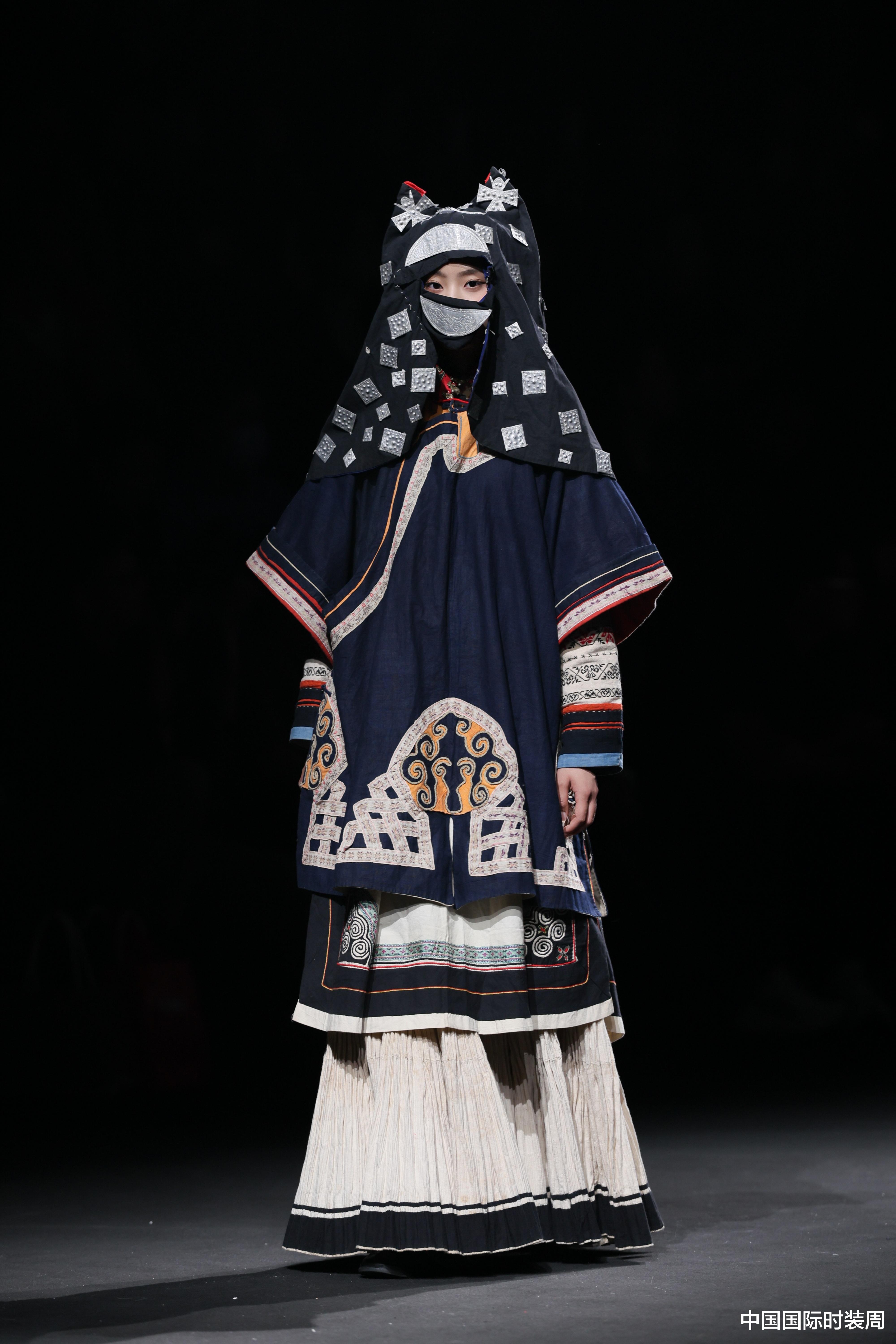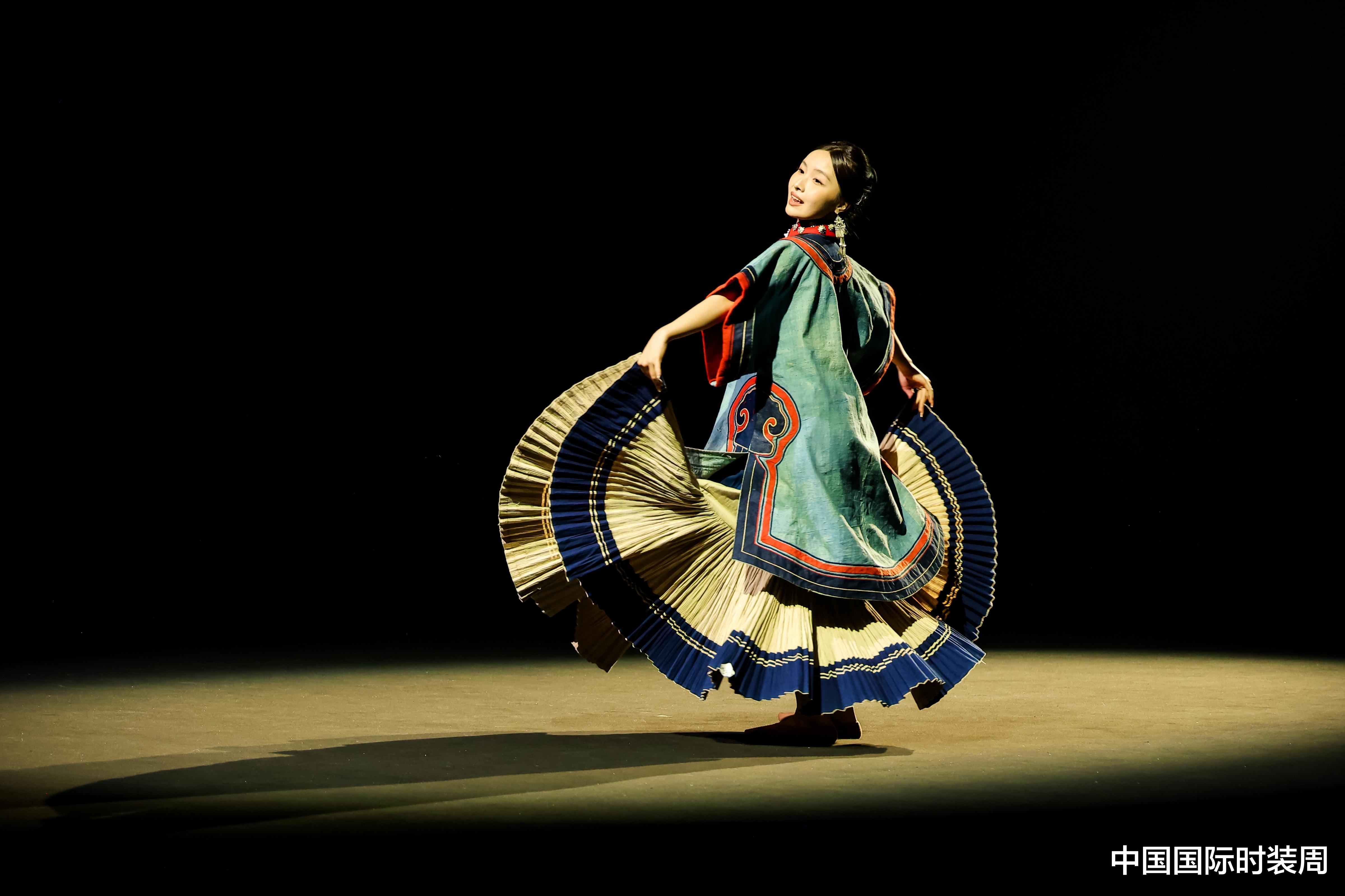 开篇“源启”极具震撼,随着“毕摩”非遗传承人以低沉雄厚的声音吟诵着对山河无恙、生活美好的祈愿,大秀缓缓拉开序幕。北京电影学院的17位舞者在女孩的百褶裙旋转飞扬,男孩的查尔瓦斗篷翻动跳跃中,再现了彝族人民劳作、节庆、嫁娶的生活场景;随后,国家级非遗传承人贾巴子则带领彝绣、银饰、音乐等国家级、州级非遗传承人和北京服装学院、北京电影学院的表演团队共同演绎了从上世纪初到当下的共约30套传统服装,复现了彝人于山河间的生活图景。“源启”以山河为序,唤醒彝人于山河间生生不息的文明图景,让千年衣脉,自大地深处缓缓归序。