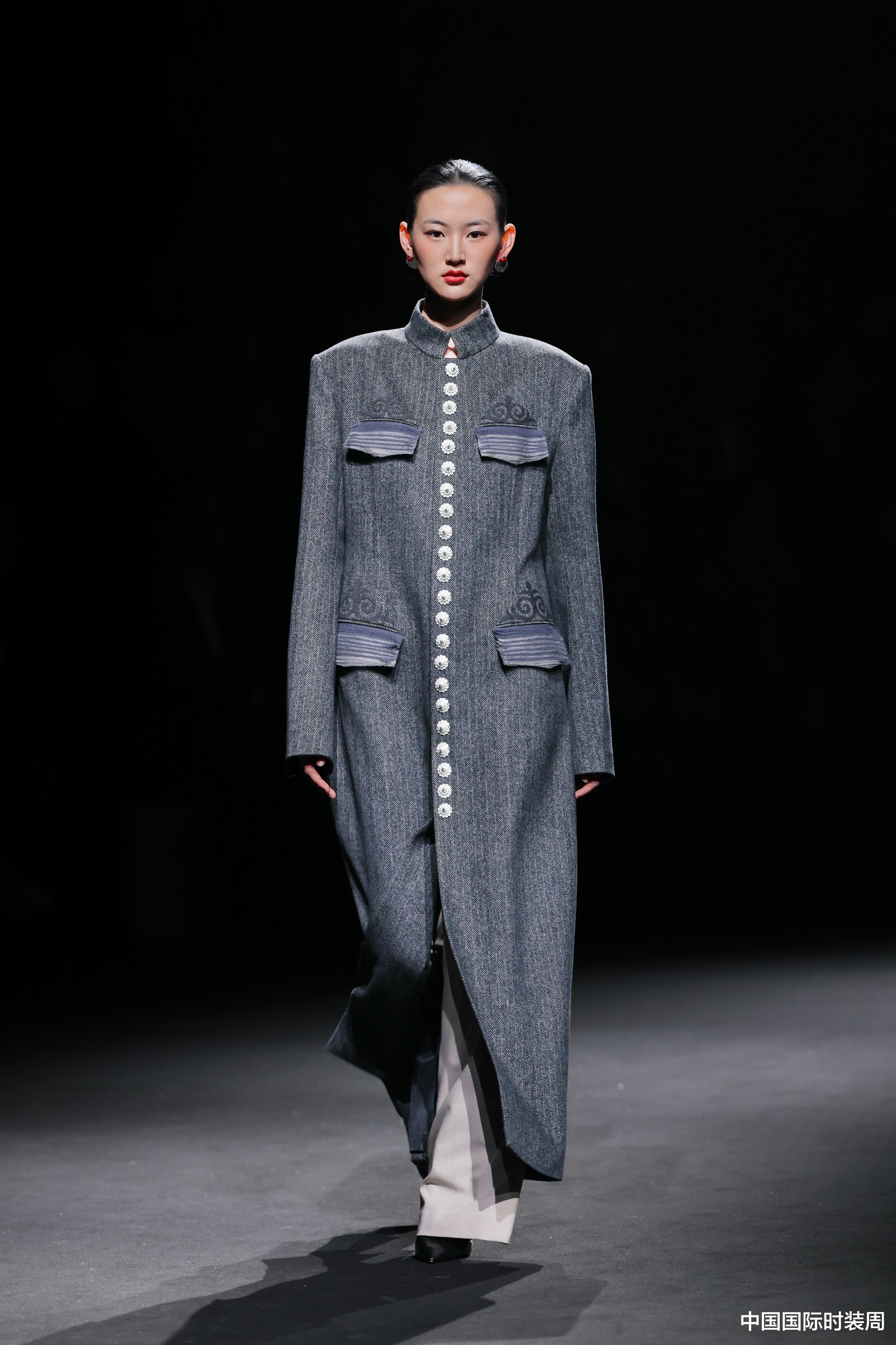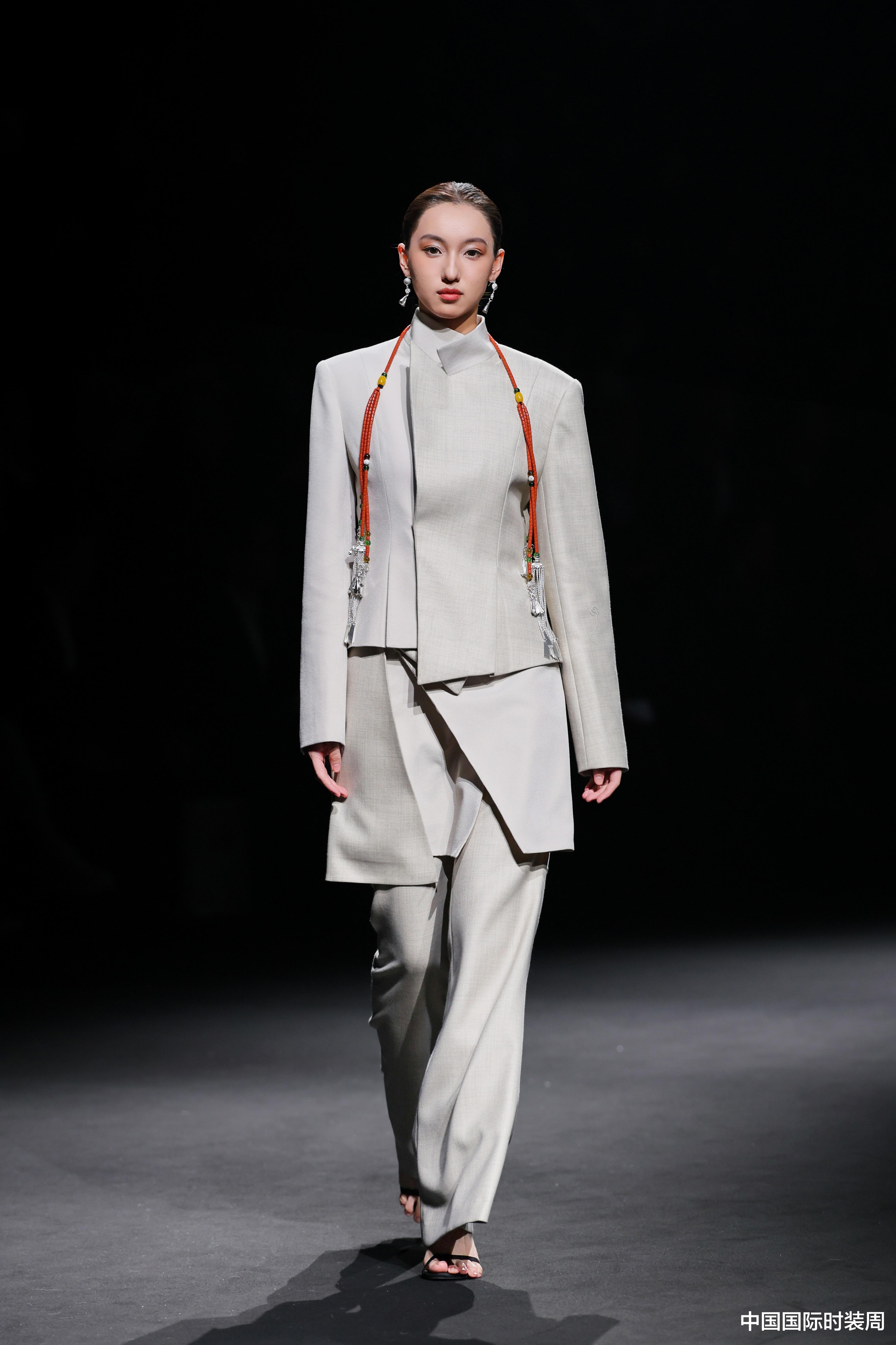 第三篇章“新生”则以近四十套大地色系的创新服饰,将传统纹样与现代面料交织成新的叙事语言——棕色承载泥土之厚重,米色示以稻麦的温润,灰色藏山石之沉静。马齿纹、火焰纹等被提炼为当代图形语言;粗精纺羊毛花呢、醋酸等面料碰撞激光切割、贴布绣、叠布绣、手工编织、压褶……,既溯源族群记忆,亦重塑当代时尚语境。在创新服装展示篇章,设计师还联合凉山州南红玛瑙品牌“小邓世家”共同打造的银饰与玛瑙首饰成为服饰搭配的亮点。本篇章的整体造型既呼应了古老的民族信仰,也是对彝族美学在当代语境中发出的既古老、又崭新的震撼回响。