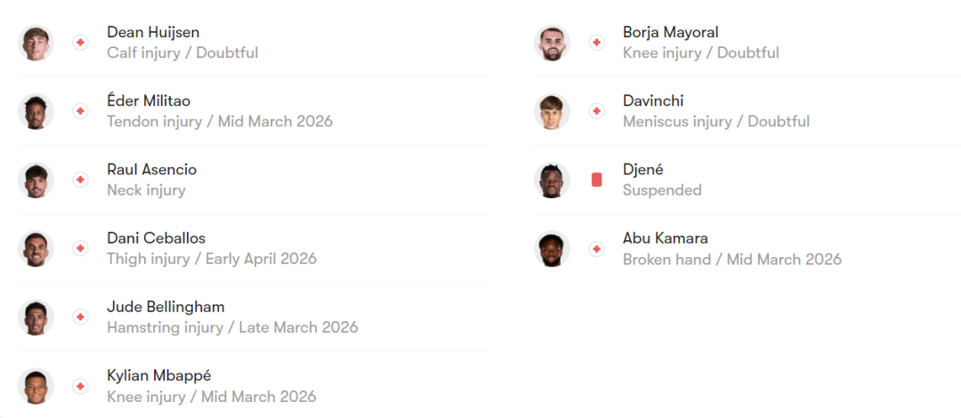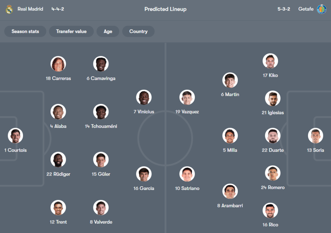 皇马方面,维尼修斯成为最关键的破局点,其边路突破和内切射门能力正是破解密集防守的利器,且职业生涯对阵赫塔费保持9胜1平的不败战绩,此役有望打破进球荒。中场巴尔韦德、楚阿梅尼将承担组织与防守重任,后防线吕迪格伤愈归队,与阿拉巴的搭档将稳固防守。