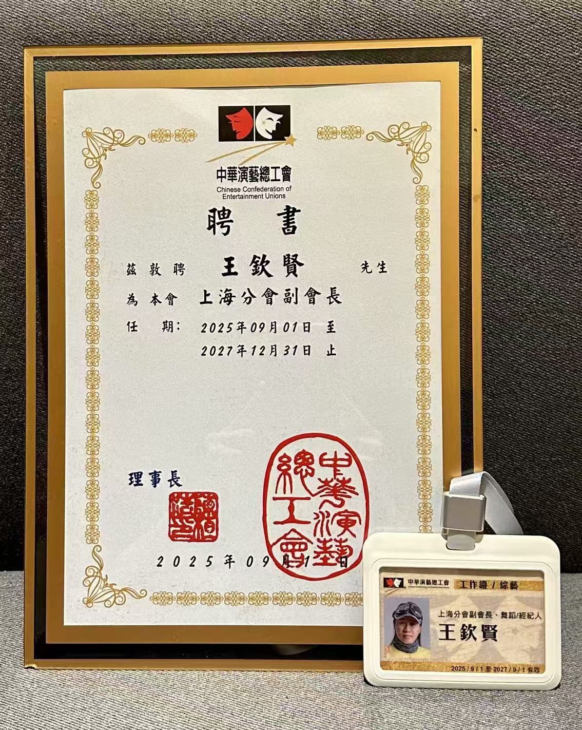 日前由中华演艺工会理事长与上海会长亲自颁发证书,正式接任上海演艺工会副会长 .