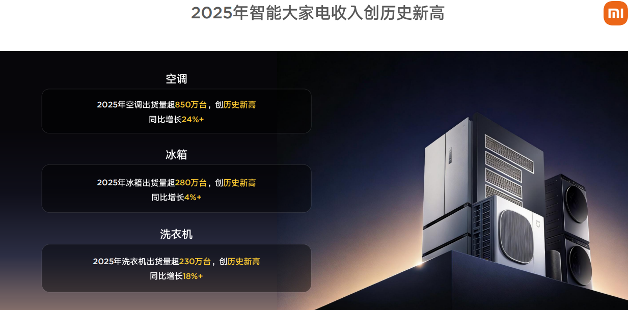 据小米2025年业绩报告,小米智能大家电收入创历史新高,同比增长23.1%。其中,空调产品出货量超850万台,同比增速超过24%;冰箱产品出货量超280万台,同比增速超4%;洗衣机产品出货量超230万台,同比增速超18%。