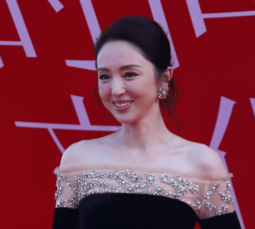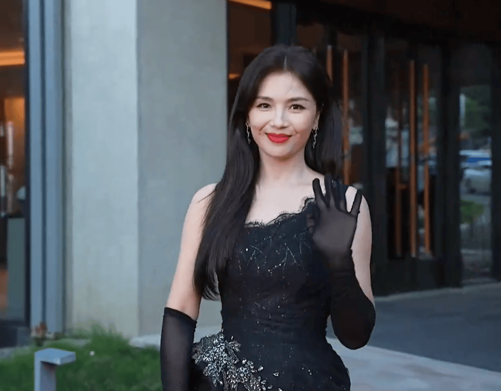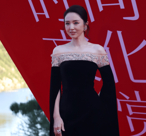 46岁的董璇还是很漂亮,一袭黑色一字肩裙勾勒出她的好身材。