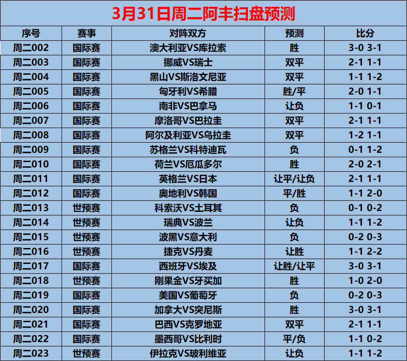 看法:本场数据给了意大利1球的支持,双方在最近的一次交手中,波黑0-1落败。波黑近期整体还是能够保持不错的不败率,上役点球淘汰对手也是士气倍增,不过球队防线端仍然存在隐患。意大利整体实力相对更佳,球队上役两球完胜对手也是展示出自己的实力。作为欧洲传统强队,相信意大利不会再次错过进入世界杯的机会。此番两队交锋,实力更加强劲的意大利仍然是更值得被看好的一方。方向:负,比分:0-2 0-3