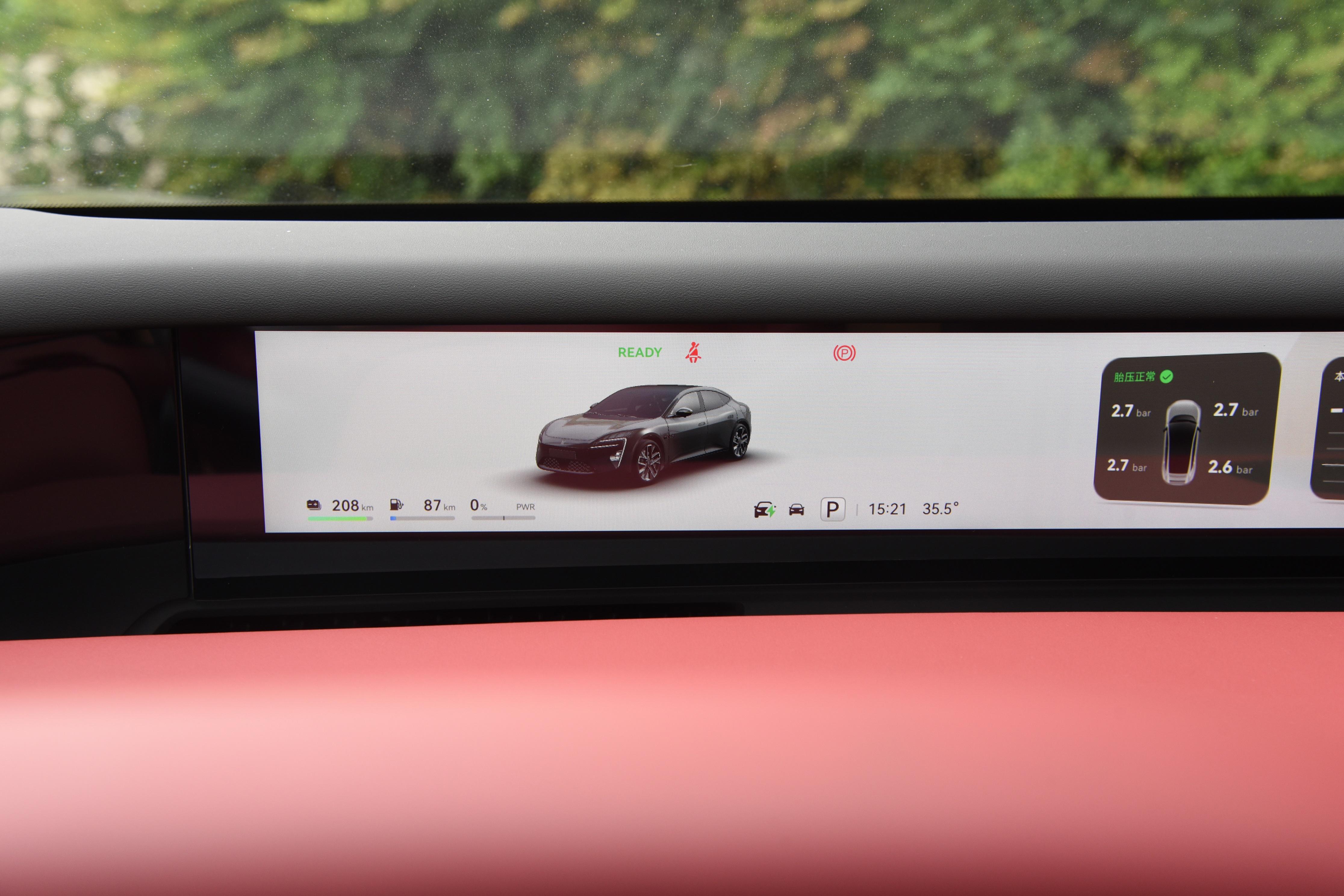 液晶仪表是一块靠近前挡风玻璃的35.4英寸带鱼屏,比较窄,但尺寸更长,显示的内容很丰富,续航、电量、驾驶信息等都能呈现,基本上能代替HUD抬头显示的功能,不用刻意低头就能读取,还是比较方便的。中控中央是一块15.6英寸的悬浮屏,内置鸿蒙座舱5系统,车机的响应速度很快,几乎感受不到延迟,各种应用切换顺滑,声纹识别能准确区分不同乘客的指令,支持可见即可说,比较聪明,模糊语义能理解。车机系统跟手机之间的互联非常方便,导航之类的都可以无缝流转,免去了每次单独手动操作的麻烦。