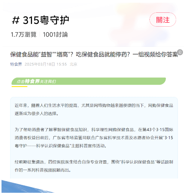 为深入贯彻落实全民科学素质提升行动,响应广东省市场监督管理局号召,广东省科学技术普及志愿者协会于2025年“3·15国际消费者权益日”期间发动专家科普志愿者、青年科技志愿者参与“315粤守护——警惕保健食品直播陷阱”主题科普宣传。