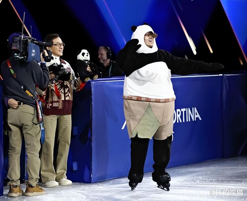 随后,成龙在冰场边迎接完成这场独特熊猫服表演的谢季罗夫。他手持熊猫玩偶,与选手拥抱,全场瞬间沸腾。